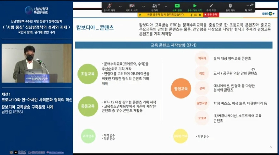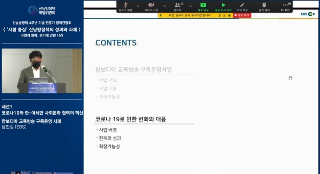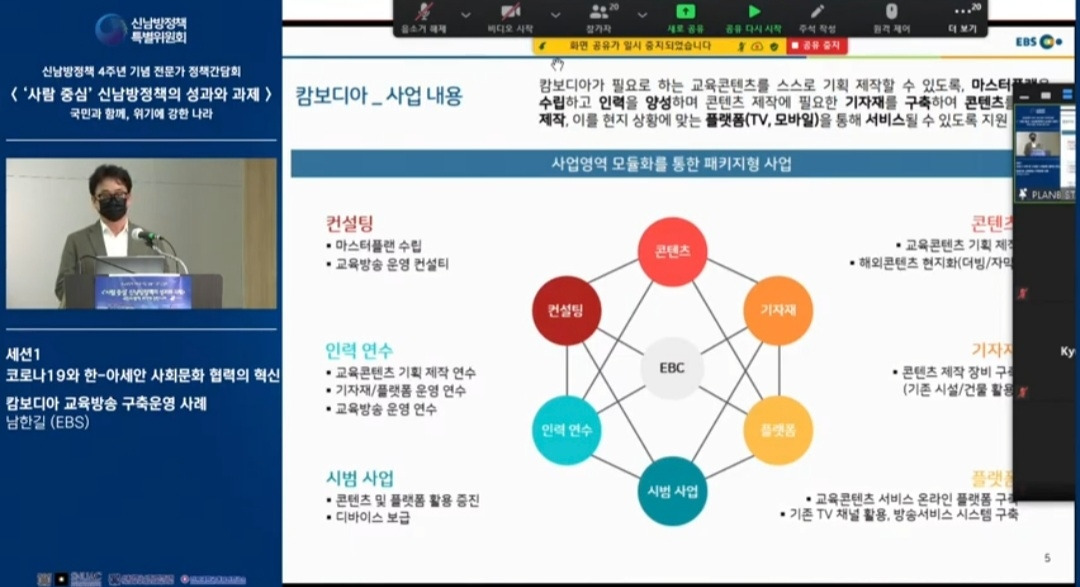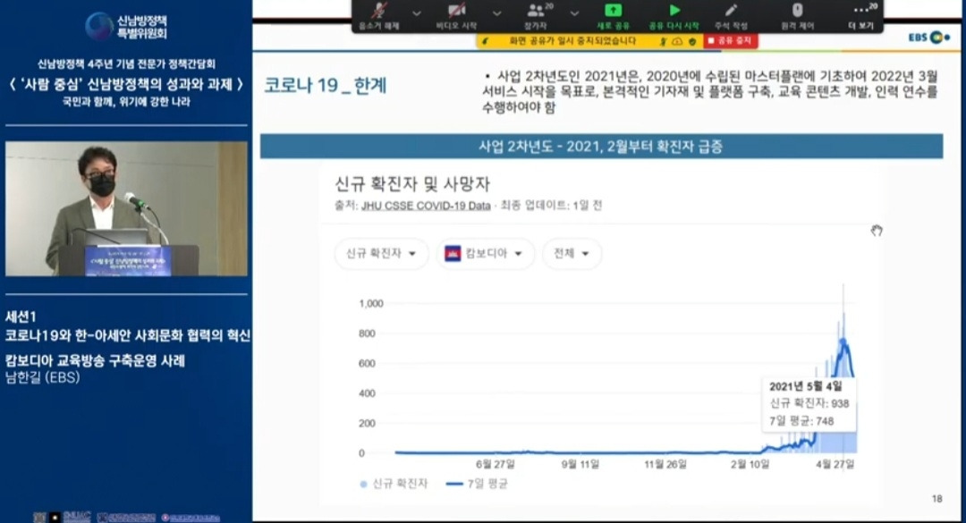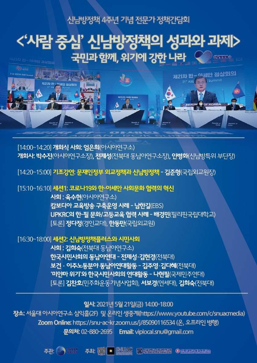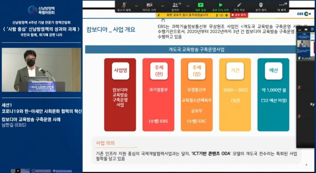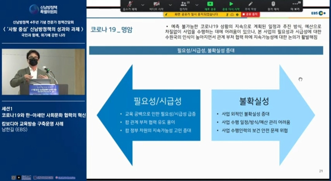 신남방정책 4주년 기념 전문가 정책간담회 '사람 중심' 신남방정책의 성과와 과제 2021.5.21. 오후2시. 서울대 아시아연구소 삼익홀(2F) - 오늘 발표 가운데 특히 내가 관심있게 본 것은 EBS가 캄보디아에 교육방송을 구축운영한 것이다. 나는 대한민국이 강대국이 되기를 진심으로 바라지만, 이제까지의 선진국이나 제국들과는 달리 '착한 강대국'이 되기를 갈망하고 있다. 말하자면 제3세계의 후진국들을 착취 수탈하는 그런 강대국이 아니라, 반세기 전만 해도 후진국이었던 올챙이 시절을 생각하면서 거들먹거리지 않고 그들에게 선한 영향력을 미치는 착하고 겸손한 강대국이 되어 인류문명에 새로운 비전을 제시하기를 바라는 것이다. 그것은 백범 김구 선생이 꿈꾼 문화강국의 실현이기도 하다.