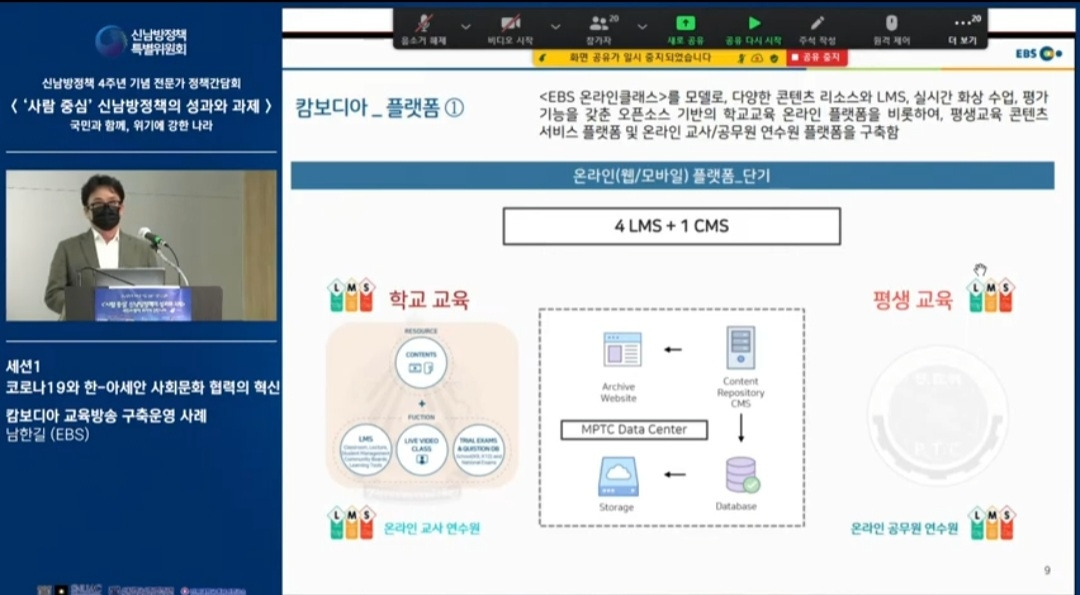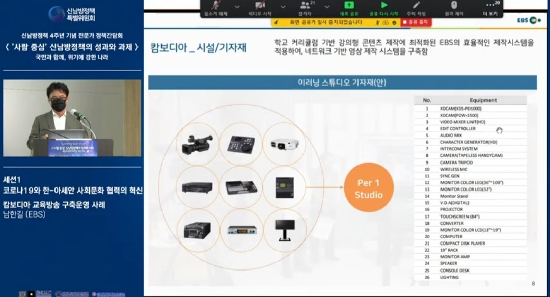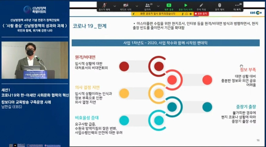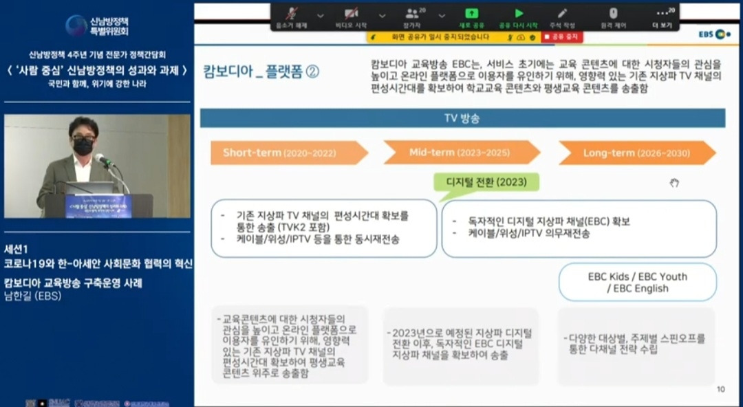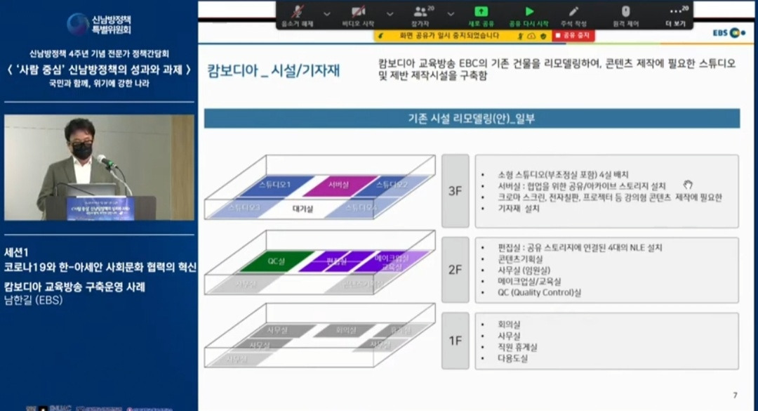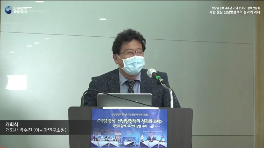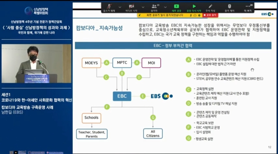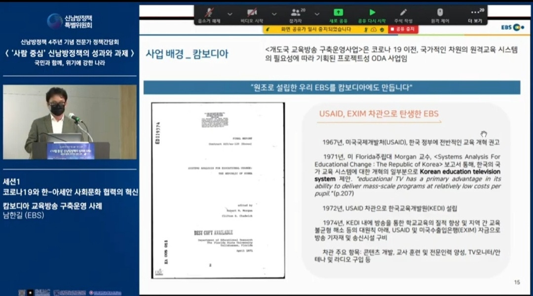 신남방정책 4주년 기념 전문가 정책간담회 '사람 중심' 신남방정책의 성과와 과제 2021.5.21. 오후2시. 서울대 아시아연구소 삼익홀(2F) - 오늘 발표 가운데 특히 내가 관심있게 본 것은 EBS가 캄보디아에 교육방송을 구축운영한 것이다. 나는 대한민국이 강대국이 되기를 진심으로 바라지만, 이제까지의 선진국이나 제국들과는 달리 '착한 강대국'이 되기를 갈망하고 있다. 말하자면 제3세계의 후진국들을 착취 수탈하는 그런 강대국이 아니라, 반세기 전만 해도 후진국이었던 올챙이 시절을 생각하면서 거들먹거리지 않고 그들에게 선한 영향력을 미치는 착하고 겸손한 강대국이 되어 인류문명에 새로운 비전을 제시하기를 바라는 것이다. 그것은 백범 김구 선생이 꿈꾼 문화강국의 실현이기도 하다.