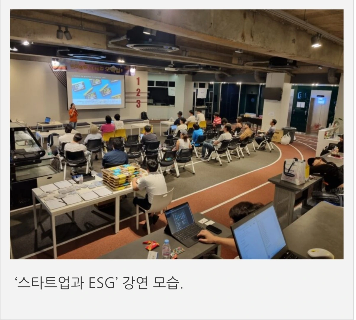 ‘민간 투자 주도형 기술창업 지원’을 받는 스타트업 관계자들이 ESG 강연을 듣는 현상만으로도 ESG가 더는 대기업에 국한한 이슈가 아님을 보여준다. 실제 스타트업은 정부 자금을 지원받거나 공공건물에 입주할 때, ESG와 관련한 사업 실천 계획을 작성해야 하거나 법인 대출을 받을 때 ESG 교육이 필수인 경우도 있다. 스타트업도 ESG를 피부로 느끼고 있다.