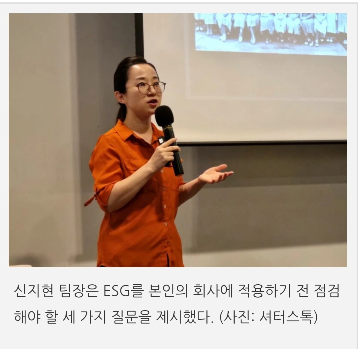 신지현 팀장은 ESG를 본인의 회사에 적용하기 전 검토해야 할 세 가지 질문을 제시했다.