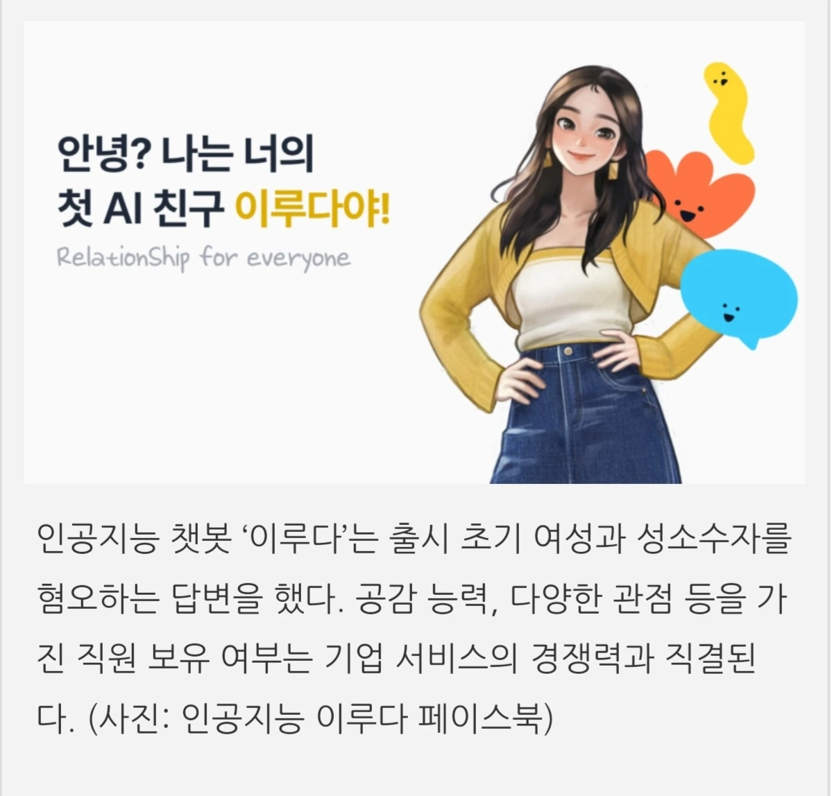 “다양성하면 떠오르는 게 뭐가 있으시죠? 저는 인종이 생각나요. 성별도 있겠네요. 인공지능 챗봇 ‘이루다’ 기억하시나요? 2020년 말에 서비스를 출시했다가 바로 접었습니다. 이유가 두 가지였는데요. 소수자, 장애인 비하 발언과 개인정보 침해가 이슈가 됐습니다. 기업에서 1년 정도 서비스를 다시 개발해서 재출시했죠. 이번에는 기술적으로 문제가 있었습니다. 근데 그 회사에서 뭐라고 해요? ‘이루다가 코로나바이러스에 걸렸다.’ 당시에는 코로나로 가족을 잃은 사람들도 있었어요. 또 이슈가 됐죠. 이루다를 개발한 스타트업의 직원 한 명이라도 ‘챗봇을 테스트해봤는데, 성희롱, 약자 비하하는 말이 나와요. 이거 출시하시면 안 됩니다. 보완해야 합니다.’ 이렇게 이야기할 수 있었으면 1년이라는 시간을 허비하지 않을 수 있었겠죠. 공감 능력, 다양한 관점 등을 갖고 있는 직원이 우리 기업에 있느냐, 이런 것들이 결국 기업 서비스의 경쟁력과 직결된다는 것이죠.”