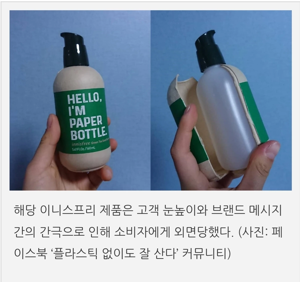마케팅 부서도 중요하다. 지난 2021년 화장품 브랜드 이니스프리는 겉면에 ‘Hello, I’m paper bottle(안녕, 나는 종이 보틀이야)’이라고 적힌 제품을 내놓았다. 실제 상품의 겉면은 종이였다. 하지만 그 종이를 잘라보니 안에는 플라스틱이 있었다. 이걸 발견한 한 소비자가 소비자고발센터에 신고했다. 실제로는 전보다 보틀을 만드는데 들어가는 플라스틱이 51.8% 줄어들었지만 정확한 정보를 제공하지 않았기에 소비자에게 외면당했다.