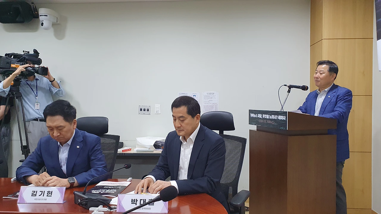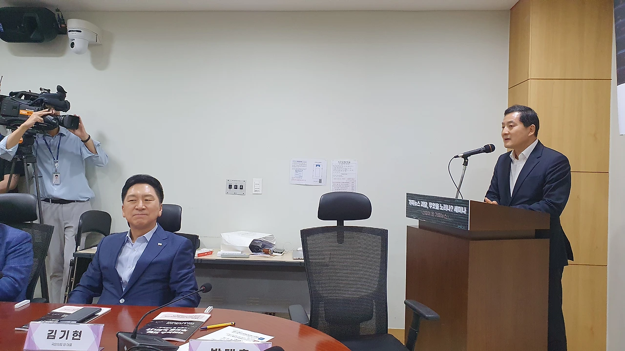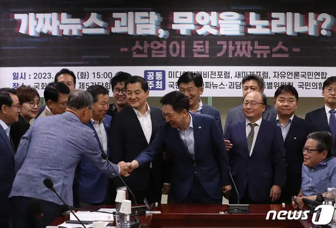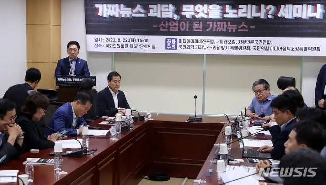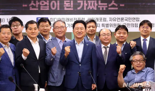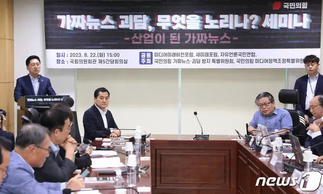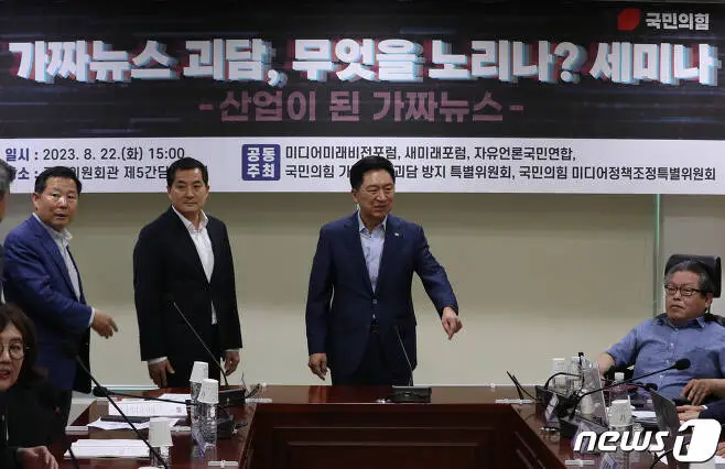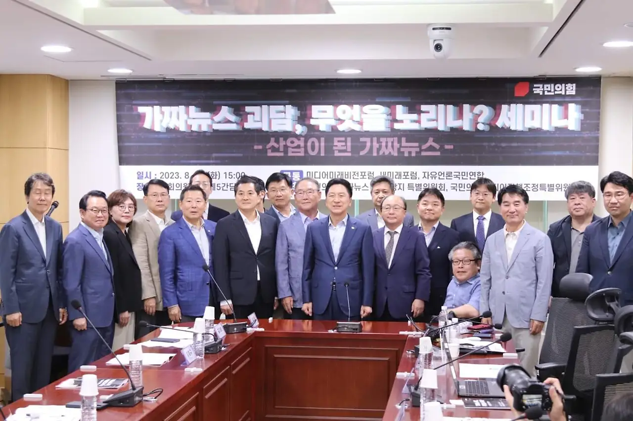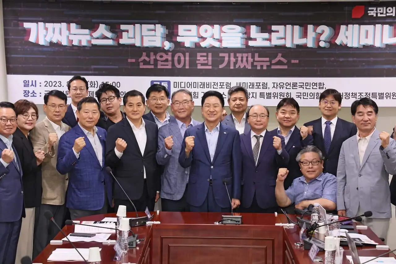 김기현 국민의힘 대표는 이날 오후 당 가짜뉴스·괴담방지 특별위원회와 미디어정책조정특별위원회가 주최한 '가짜뉴스·괴담, 무엇을 노리나' 세미나에서 "야당이 갖고 있는 권력과 가짜뉴스 가짜방송을 막 실어나르는 가짜언론, 그리고 그걸 통해 돈을 버는 권·언·정 유착이 아주 커다란 카르텔을 형성하는 게 오늘의 모습"이라고 말했다.