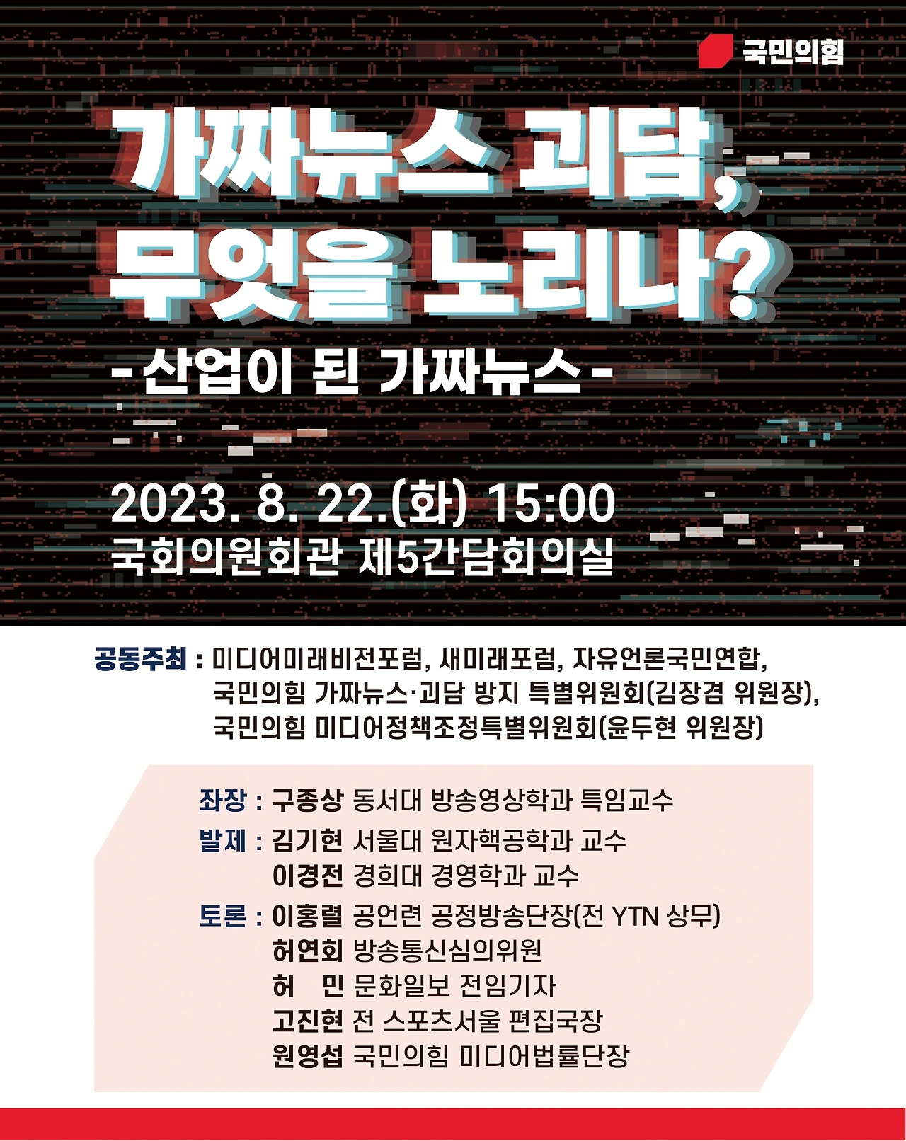 윤두현 국민의힘 의원은 "가짜뉴스 괴담의 온상은 포털과 유튜브이고 놔두면 감당할 수 없는 결과가 나올 것"이라며 "이를 막을 수 있는 확실한 방법은 범죄 이익을 없애는 엄벌주의"라고 말했다.