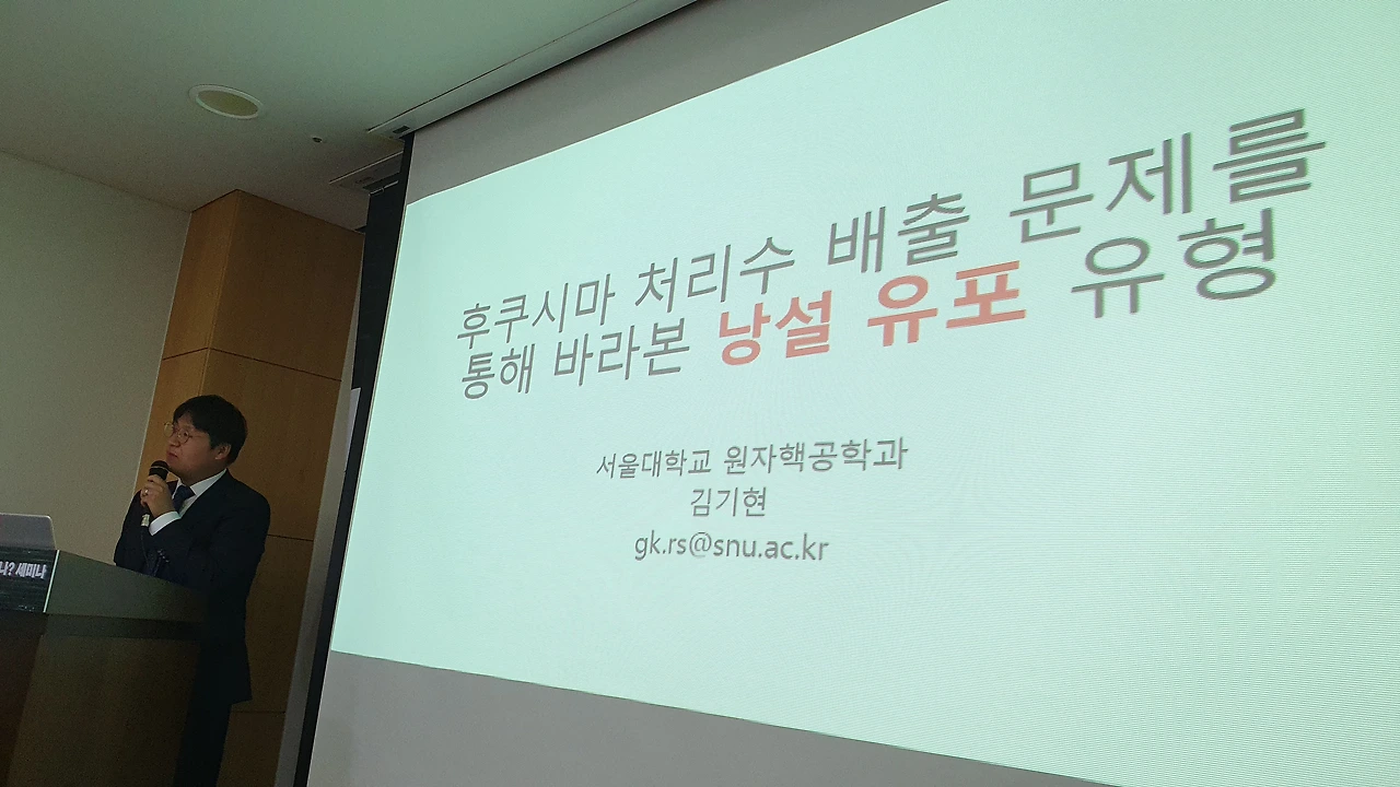 발제에 나선 김기현 서울대학교 원자핵공학과 교수는 "후쿠시마 원전 처리수 낭설은 '외계인이 쳐들어와서 우리를 다 죽일 것인데 외계인 침공에 대비할 방책을 만들어야 한다'는 식의 언급"이라며 "덮어놓고 불신을 조장한다"고 지적했다.
