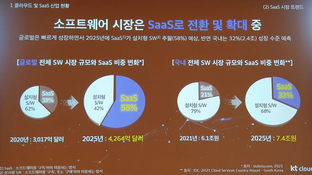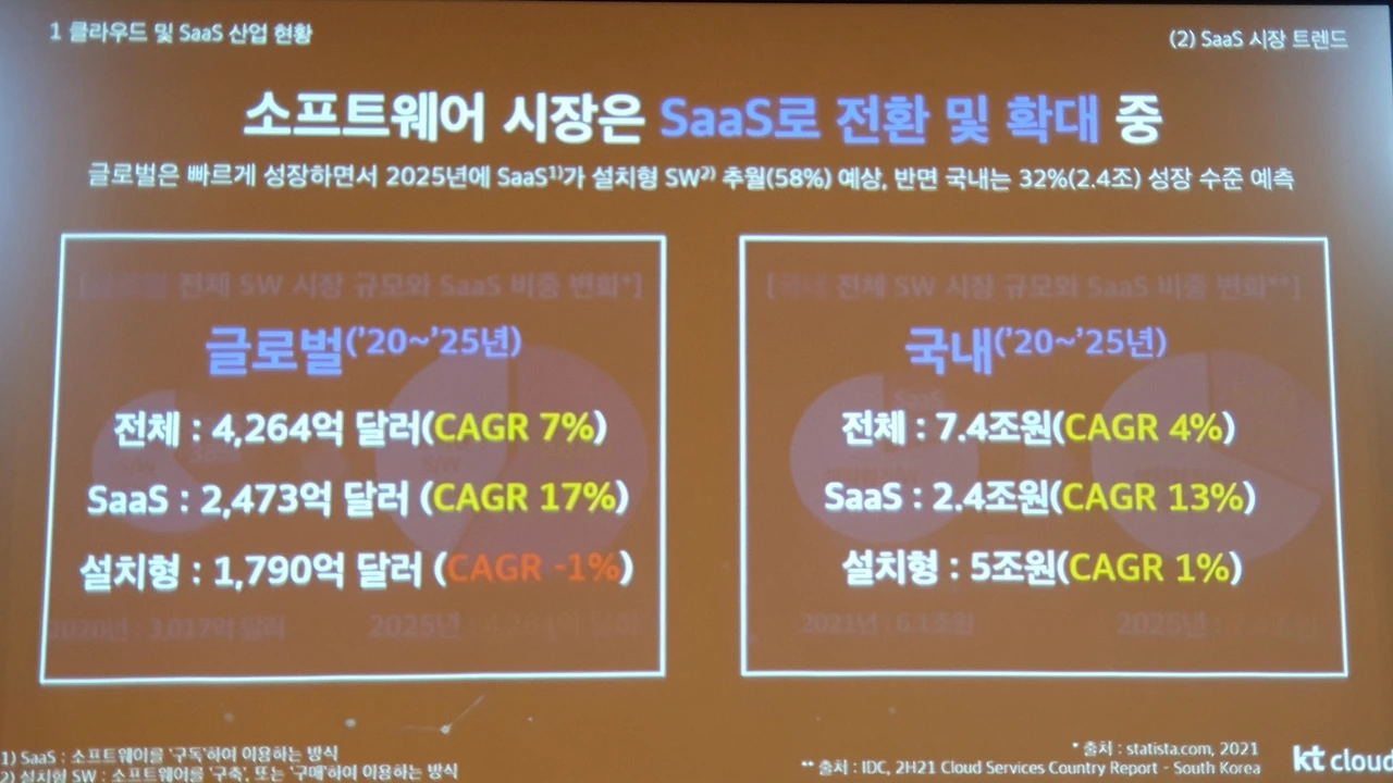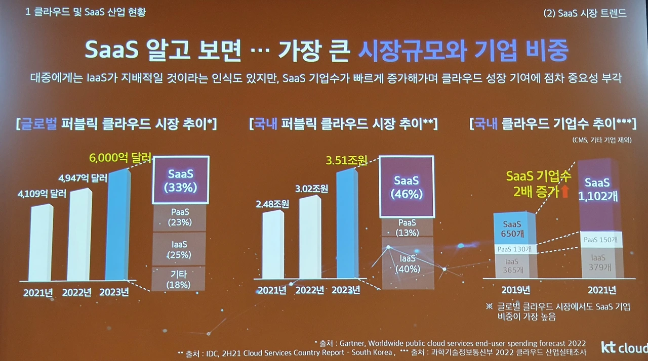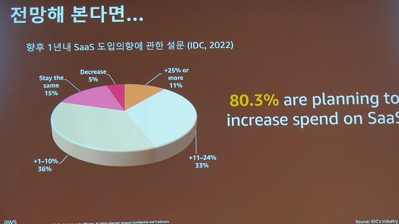 그는 IDC 자료를 토대로 국내외 SaaS 시장 규모가 가파르게 성장하고 있다고 설명했다. IDC는 지난해 전세계 SaaS 시장 규모는 2천452억 달러(약 318조 원)에 달하며, 연간 성장률은 22%로 전망했다. 향후 1년 내 SaaS 도입 의향을 묻는 설문에 기업 80.3%가 SaaS 사용을 늘리겠다고 답변했다.