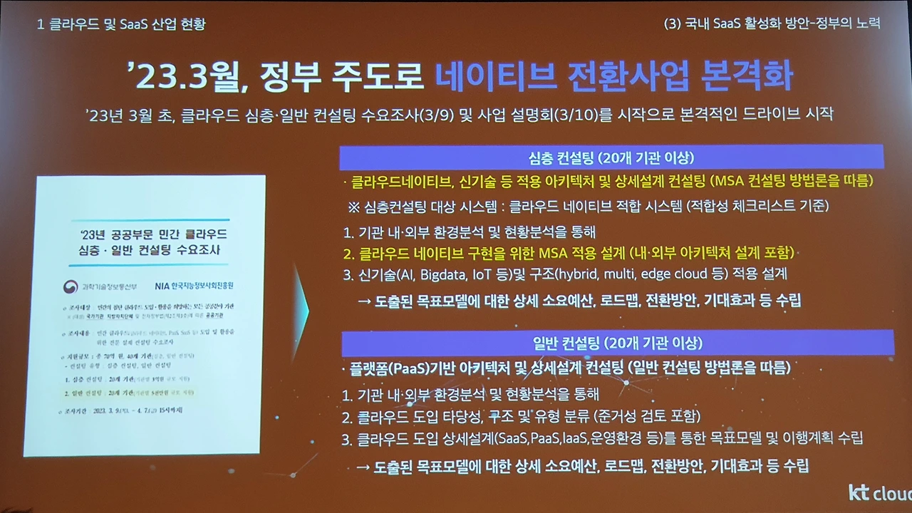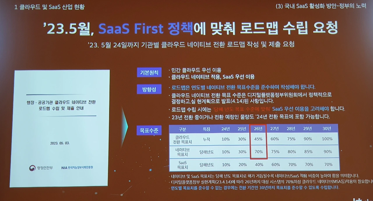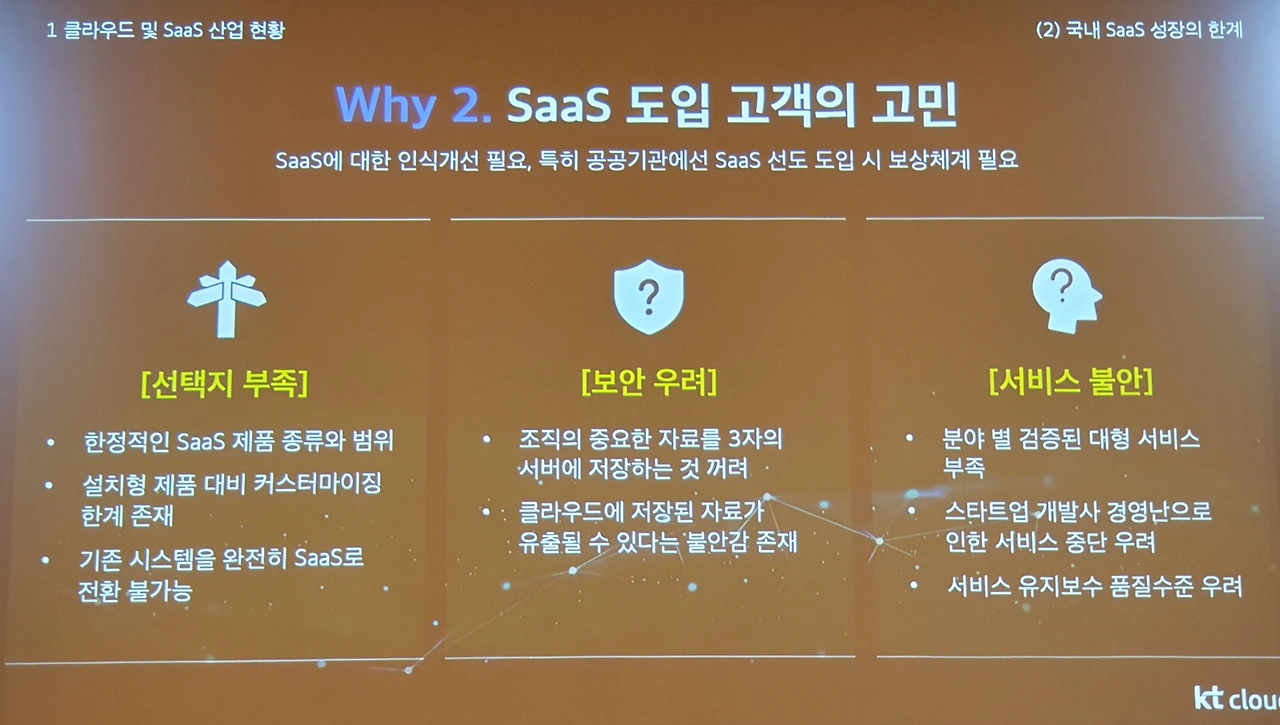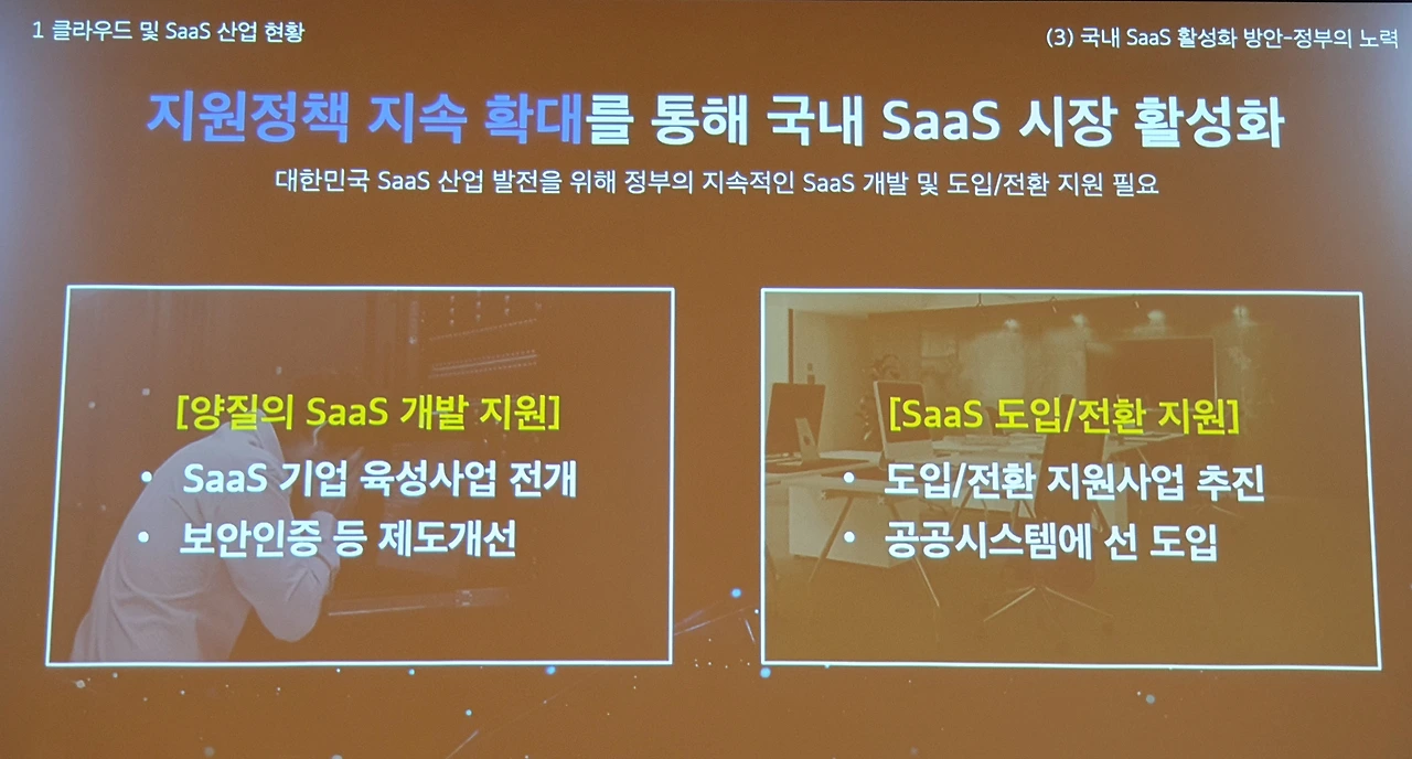 그는 IDC 자료를 토대로 국내외 SaaS 시장 규모가 가파르게 성장하고 있다고 설명했다. IDC는 지난해 전세계 SaaS 시장 규모는 2천452억 달러(약 318조 원)에 달하며, 연간 성장률은 22%로 전망했다. 향후 1년 내 SaaS 도입 의향을 묻는 설문에 기업 80.3%가 SaaS 사용을 늘리겠다고 답변했다.