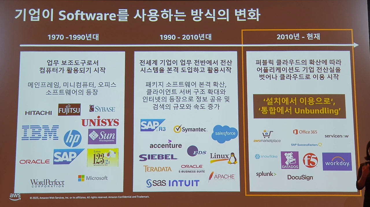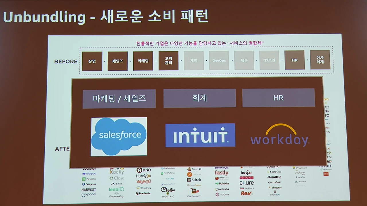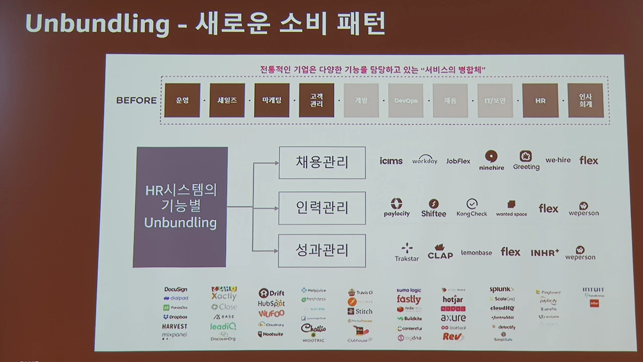 기업들의 소프트웨어 이용방식도 클라우드 기반의 구독형과 언번들링(하나의 서비스를 쪼개는 방식)으로 변하는 추세다. 송주현 총괄은 "이제는 기업들이 각각의 상황과 활용에 맞는 SW를 가져와서 쓰고 있다"면서 "마케팅·세일즈의 경우 세일즈포스, HR(인사관리)는 워크데이 등 언번들링이 진행되고 있고 기업 고객들의 SW 선택의 폭도 넓어졌다"고 설명했다.