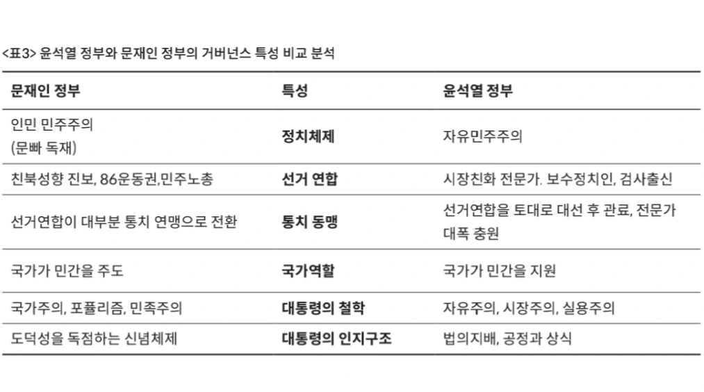 문재인 정부와 윤석열 정부 사이에서 국정 운영의 내용과 구성 체계를 놓고 격렬한 ‘거버넌스 시프트’가 일어나는 중이다. <표3>에서 보듯이, 문 정부의 국정 거버넌스는 ‘운동권과 청와대가 중심이 된 국가 주도’였지만, 윤 정부의 그것은 ‘전문가와 시장을 중시하는 국가 지원’ 체제를 추구한다. 윤 대통령은 문 전 대통령의 ‘도덕성 독점’이 거버넌스의 실패를 불렀다는 점을 반면교사로 삼아, 여야 협치를 통한 국정 운영의 뉴 거버넌스를 구축해야 할 과제를 부여받고 있다.