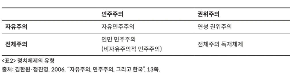 한국 정치 패러다임은 문재인 정부와 윤석열 정부의 출범으로 큰 변혁을 맞이했다. 정치체제는 <표2>에서 보듯이, 정치 체계 유형은 자유주의 대 전체주의, 민주주의 대 권위주의를 구분으로 4개 유형으로 구분할 수 있다.