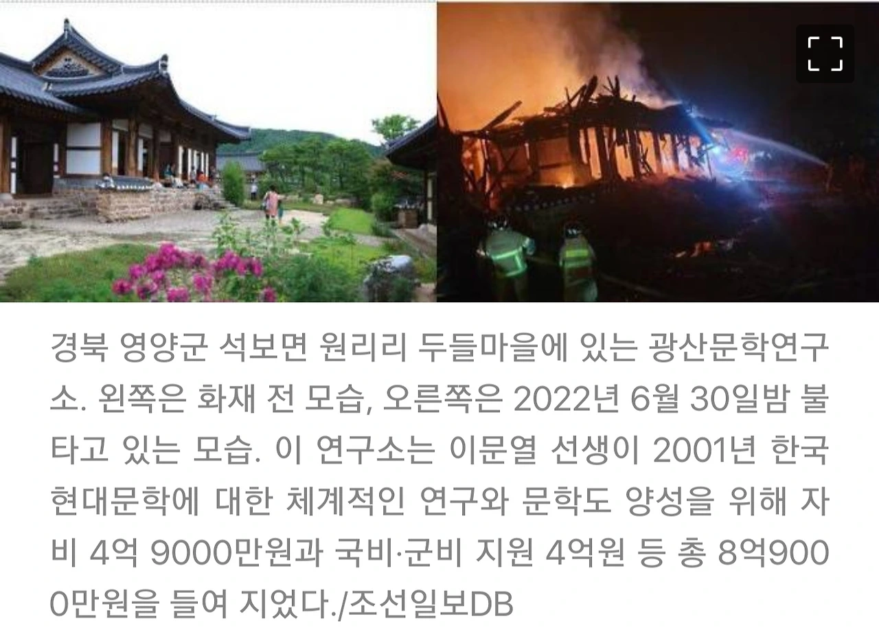 - 작년 6월말 애지중지하던 물건들을 모아놓은 고향 영양(英陽)의 광산문학연구소가 불에 타 전소됐는데.
