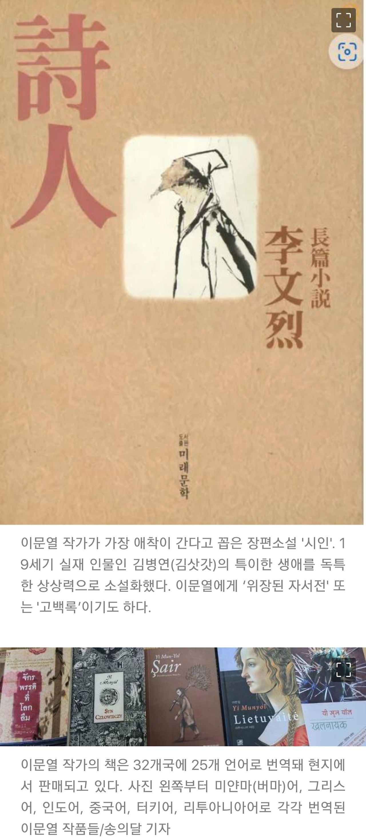 “모든 작품에 애착이 가지만 하나만 꼽는다면 소설 ‘시인(詩人)’이다. 삿갓 하나 쓰고 세상을 유랑한 전설적인 시인 김삿갓(김병연)의 생애를 상상력으로 소설화했는데, 월북한 아버지를 지우려고 소설로 방황의 세월을 보낸 나에 대한 자전적(自傳的) 스토리이기도 하다. 세계 20여개국에서 번역·출간돼 11개국에서 재판(再版) 이상 발행한 걸로 안다.”