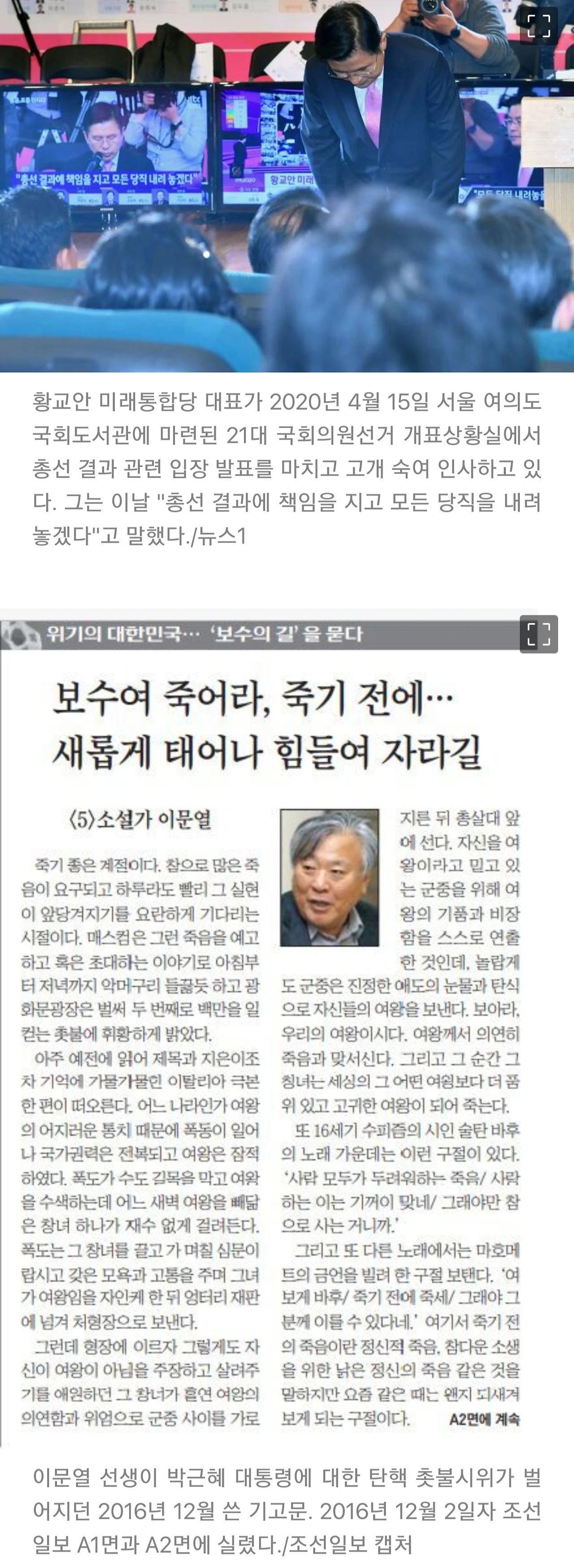 그는 “김대중 대통령 같은 이는 야당(野黨) 시절에도 책을 많이 읽어선지 ‘말을 아는’ 사람이었다. 지금 어느 야당 대표와 같은 잔인성, 표독성, 사기(詐欺)성과는 거리가 멀었다. 정치권 전체를 둘러 봐도 여·야 모두에 인물이 없다”고 했다.