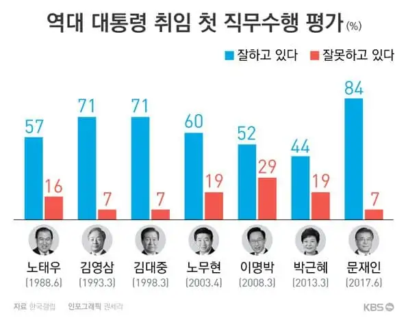 기존의 대통령들이 당선 열기에 따라 취임 초반 지지율이 70% 이상(YS DJ 문재인이 그러했다. 60% 노무현도 있다) 치닫는 것과는 다르다.