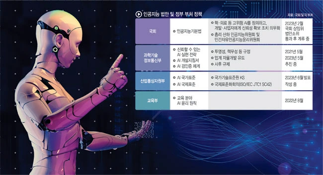 국내 기업들은 인공지능(AI) 표준 구축을 위한 자율 경쟁으로 발 빠르게 움직이고 있지만, 정부 규율은 이를 제대로 뒤따라가지 못하고 있다. 부처 간 AI 정책이 중복되거나 엇박자를 내면서 업계에 오히려 혼란을 가중시키고 있다. 정부는 AI 관련 법안도 전 세계에서 가장 먼저 출발했지만 여야 대치 정국 속에 법안이 표류하면서 세계 최초의 영예도 뺏길 위기다.