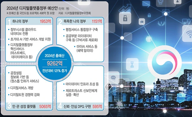 인공지능(AI)을 정부의 입법·사법·행정 등 공공 부문에 접목해 국민에게 칸막이 없는 원샷 서비스를 제공하고, 해외에는 AI 정부를 국가 전략 산업으로 수출하려는 곳이 있다. 바로 윤석열 대통령 직속 디지털플랫폼정부(DPG) 위원회다. DPG는 공공 행정을 단순히 디지털화하는 데 중점을 뒀던 과거의 전자정부나 양방향 맞춤 행정 서비스를 제공하겠다던 정부 3.0과는 다르다. DPG 위원회는 최근 출범 1년 기자회견에서 오는 2024년 9262억 원의 예산을 △하나의 정부 △똑똑한 나의 정부 △민·관이 함께 하는 성장플랫폼 △신뢰하고 안심할 수 있는 DPG 등 4대 분야에 중점 투자하겠다고 밝혔다.