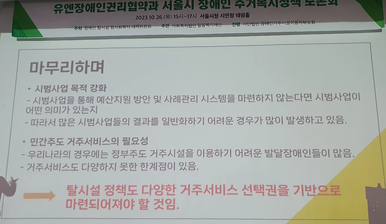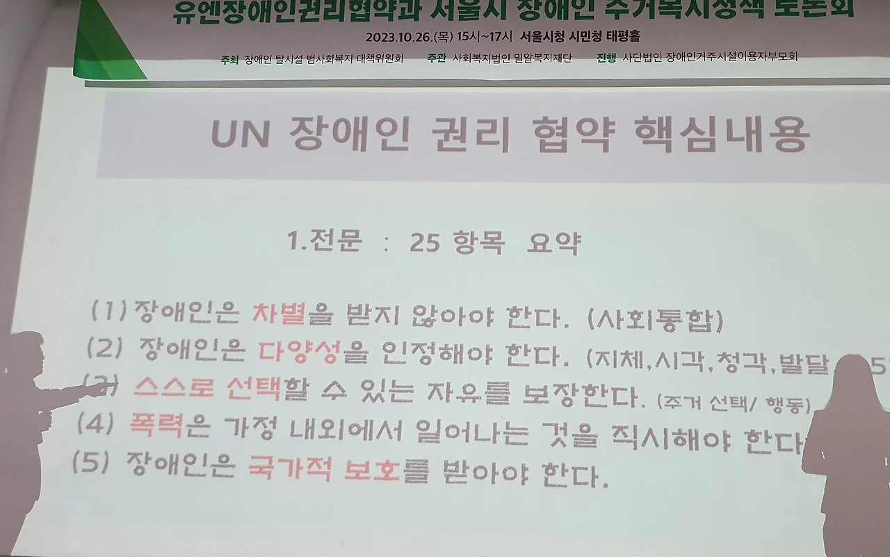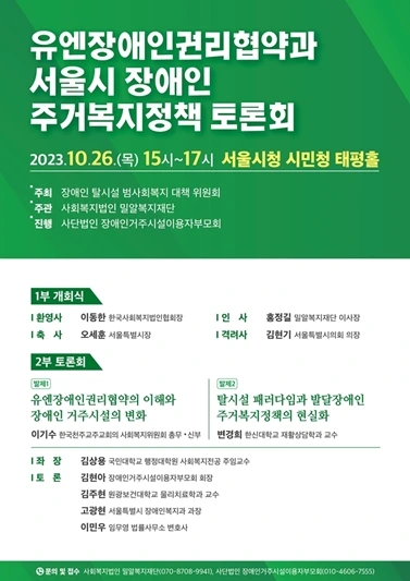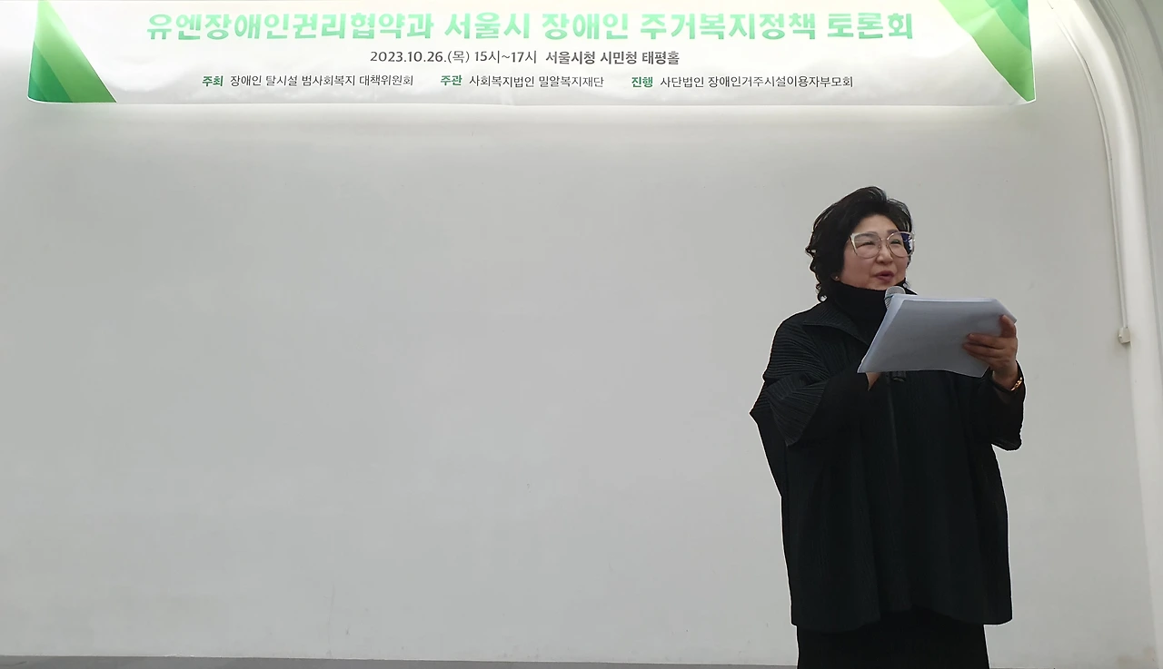 이번 토론회는 유엔장애인권리협약과 서울시 장애인 주거복지정책의 개선 방향을 제시하고 장애인의 지역사회 자립을 위한 바람직한 정책 방향을 심도 있게 논의하고자 마련됐다.