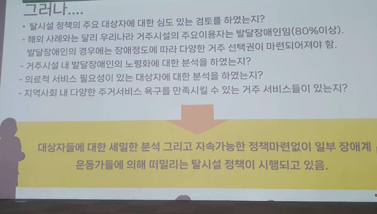 변경희 교수는 “탈시설에 있어 발달장애인과 신체장애인의 지원은 차별화돼야 한다. 주거 필요성에 따른 발달장애인 개개인의 거주선택권이 보장되고 이를 지원할 수 있는 서비스가 함께 고려되어야 한다”며 대상자들에 대한 세밀한 분석과 지속가능한 정책 마련 없이 획일적인 탈시설 정책이 시행되는 것에 대한 우려를 밝혔다.