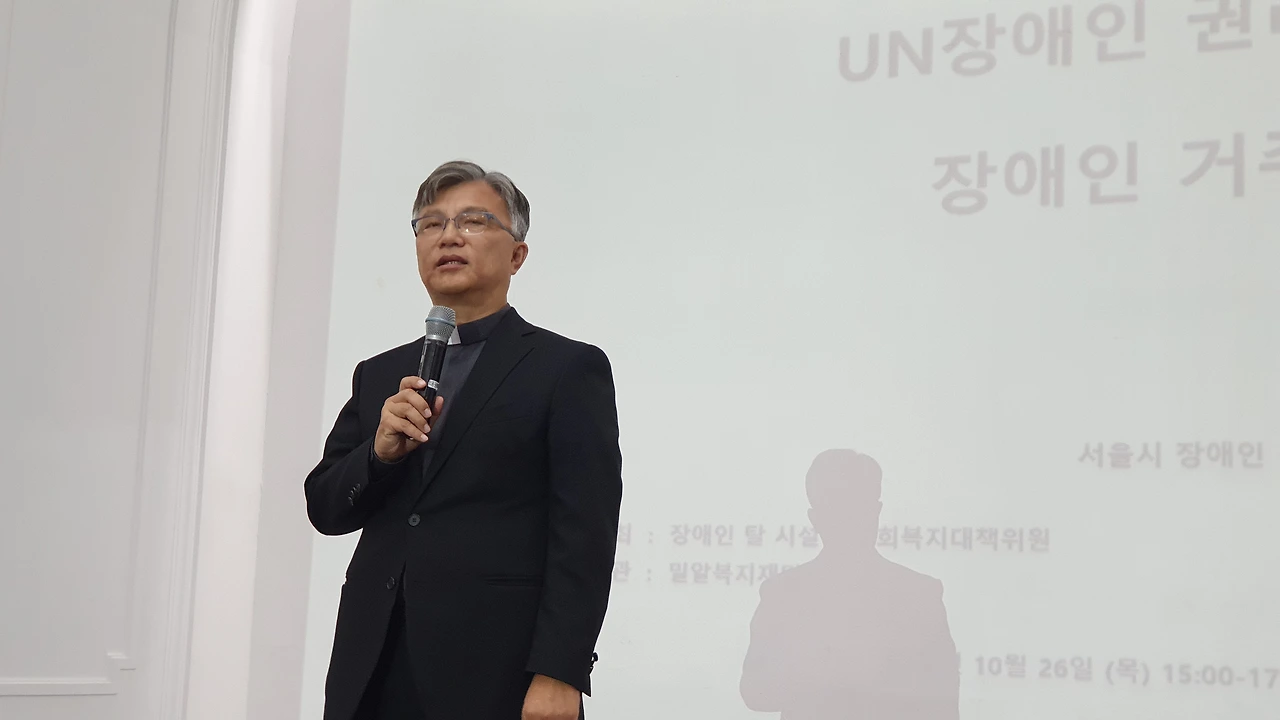 이기수 신부는 “유엔장애인권리협약의 정신은 장애인이 어디에 살건 본인의 의지와 결정을 존중하고 그 과정에서 다른 사람이 개입할 수 없다는 것을 뜻한다”며 “유엔이 말하는 탈시설을 공간적 의미로만 해석할 것이 아니라, 장애인이 획일화된 삶에서 벗어나 자율적인 판단으로 살아야 한다는 내용적 의미로 해석해야 한다”고 주장했다.