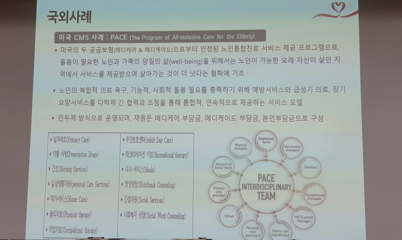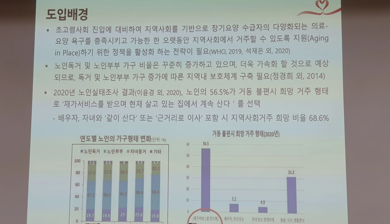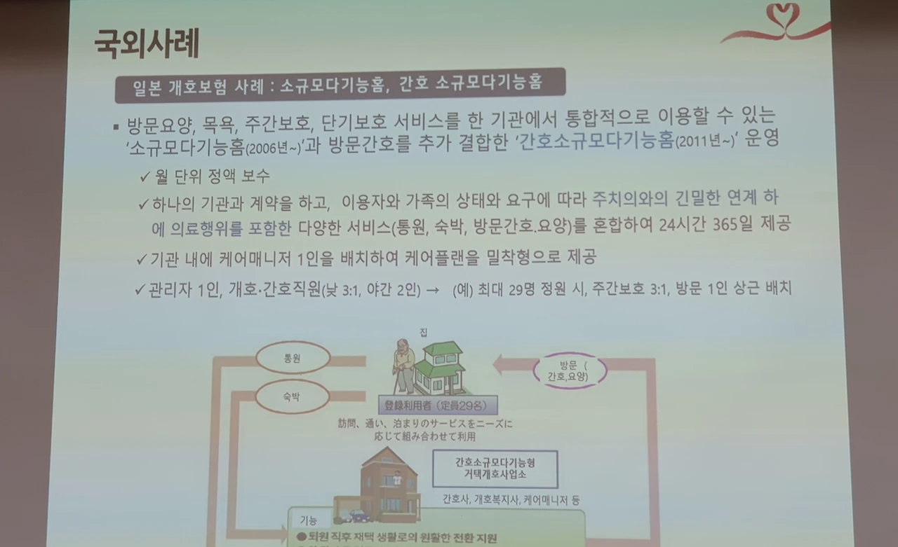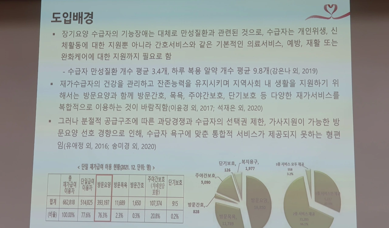 인하대학교 간호학과 김선희 교수는 “원하는 시간과 장소에 맞춘 서비스 제공은 매우 바람직한 방법”이라며 “한 기관에서 다학제 팀워크체계에 기반해 수급자에게 필요한 재가서비스를 혼합 제공하고 특화된 의료서비스를 연계해 제공할 방안이 필요하다”고 말했다. 이어 방문간호 기반형 통합재가서비스 모델이 그 역할을 충분히 할 수 있다고 강조했다.