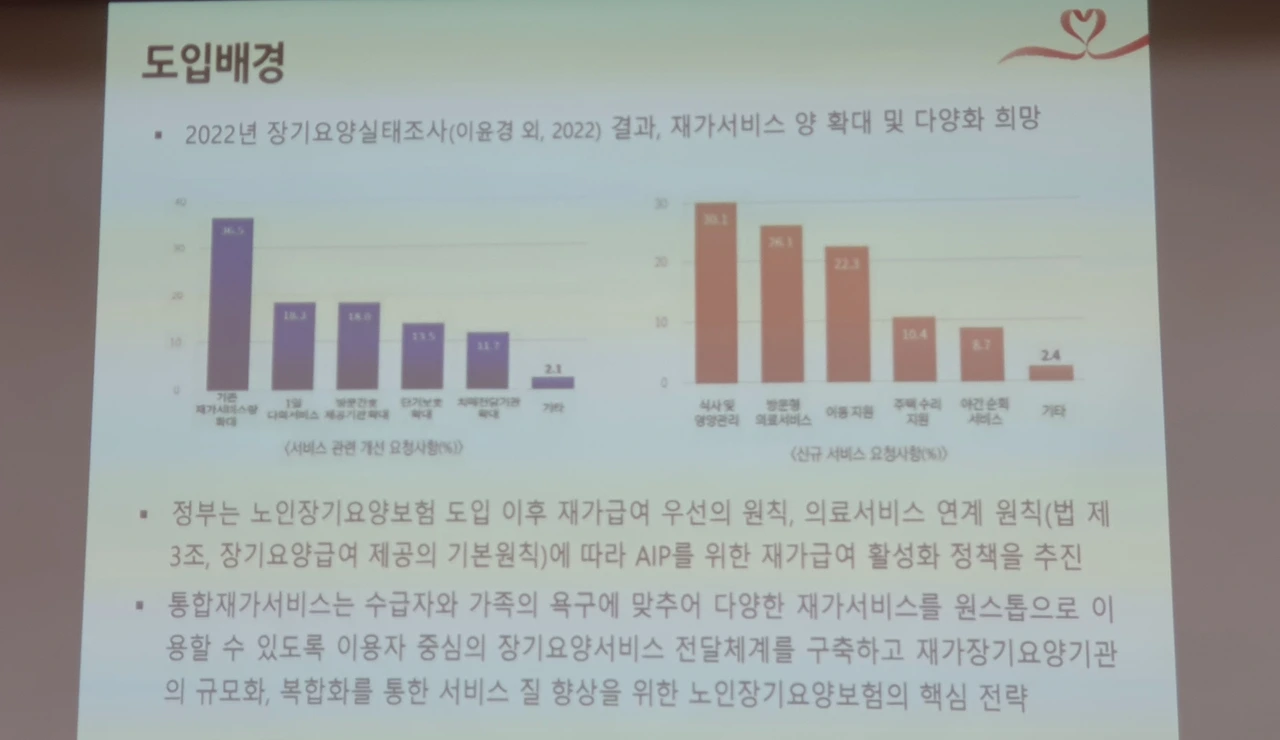 가천대학교 사회복지학과 남현주 교수는 “현재 노인장기요양보험제도 내에 있는 재가급여의 종류가 매우 제한적”이라며 “장기요양대상자의 자립성과 잔존능력을 유지하기 위해서는 다양한 재가급여를 도입할 필요가 있다”고 지적했다.