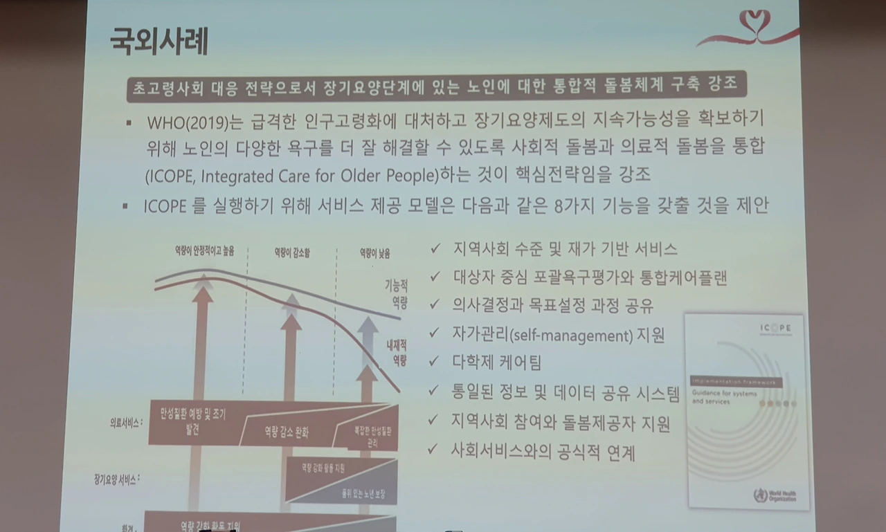 이어 숭실사이버대학교 요양복지학과 김정은 교수는 ‘일본 지역포괄케어시스템 추진의 시사점’이라는 발표를 통해 통합재가서비스제도의 과제와 비전을 밝히면서 “지역특성을 반영한 서비스 개발로 사업자를 유도하고 이용자를 확보해야 하며 지역공생을 위한 다양한 운영 주체의 참여를 촉진해야 한다”며 “지역사회통합돌봄 성공의 열쇠는 케어매니지먼트”라고 말했다.