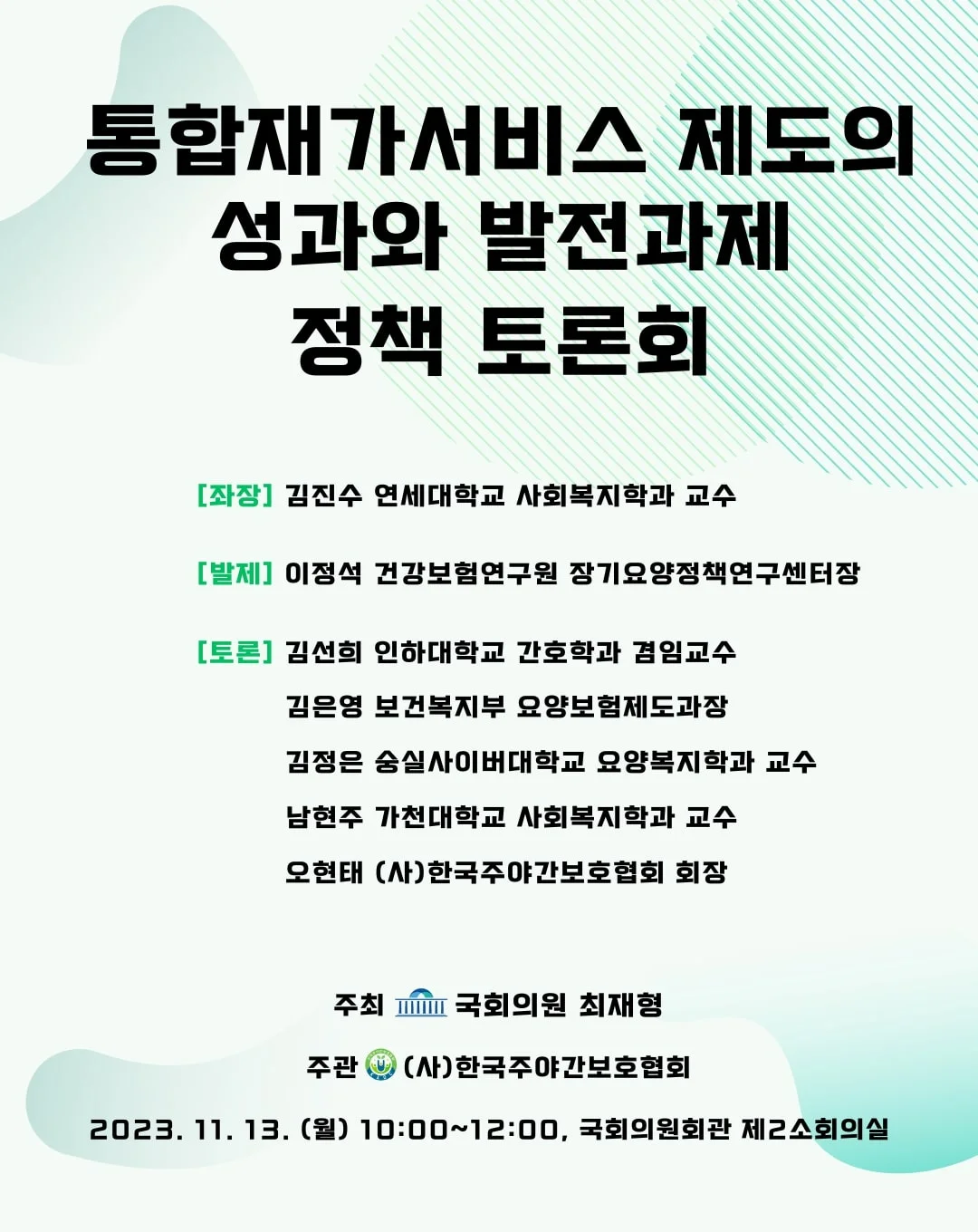 국회의원회관에서 국회보건복지위원회 소속 최재형(국민의힘) 의원이 주최하고 한국주야간보호협회가 주관한 ‘통합재가서비스제도의 성과와 발전과제 정책토론회’가 개최됐다.