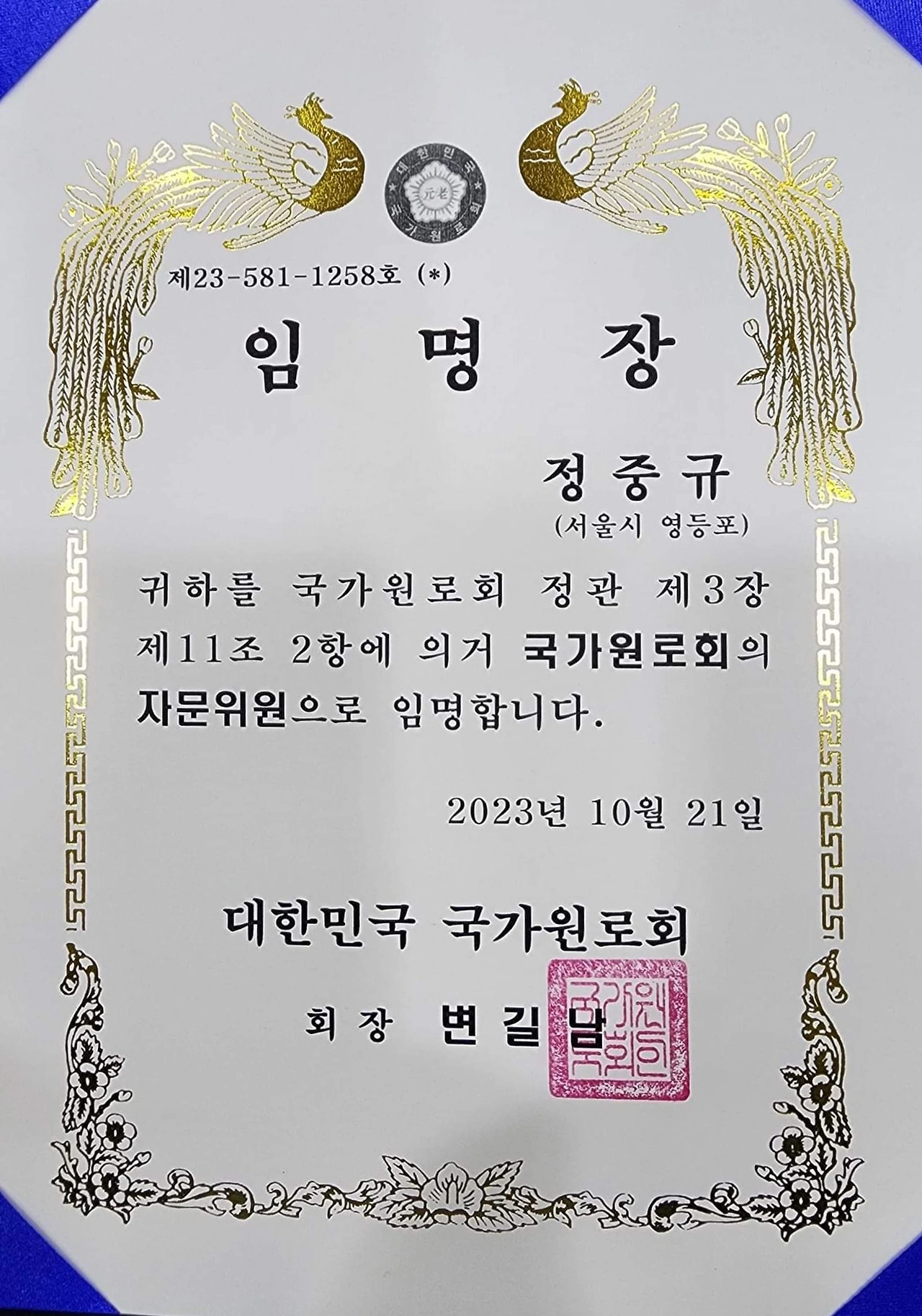 대한민국 국가원로회 자문위원 위촉 / 정중규