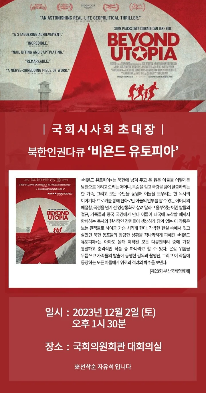 ▶탈북민을 다룬 영화 ‘크로싱’에서 북에 두고 온 아들을 찾기 위해 애쓰는 아버지로 나오는 배우 차인표씨는 “비참한 사정에 처해 울고 있는 (북한) 사람들을 위해 함께 울어주었으면 하는 바람이 있다”고 했다. 북한 실상과 탈북민들의 비참한 처지는 알수록 충격적이다. 이들을 돕는 것은 민족을 떠나 인간으로서 해야 할 의무다. 하지만 ‘비욘드 유토피아’는 아직 국내 영화관 개봉 소식이 없어 안타깝다.