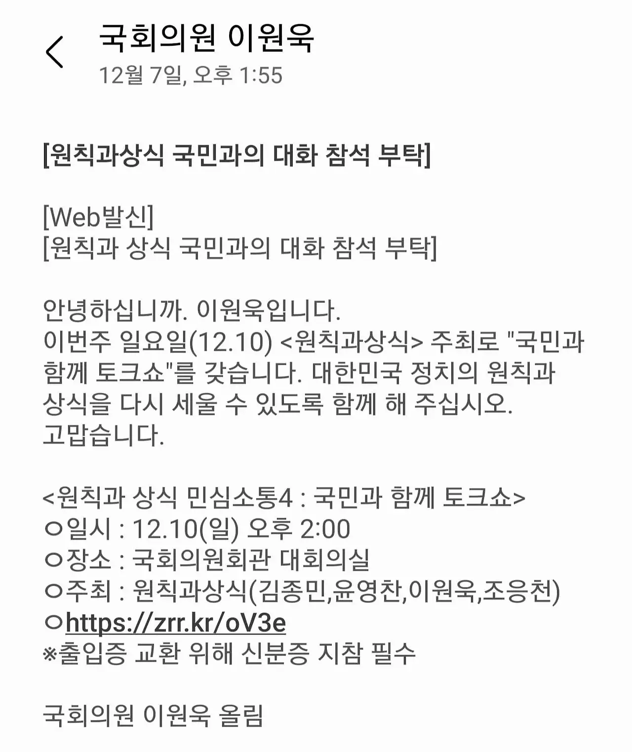 이렇게 오늘 토크쇼 참석 부탁 문자가 왔는데..이재명 퇴치엔 한 마음이니 참석해 들어볼까 한다.