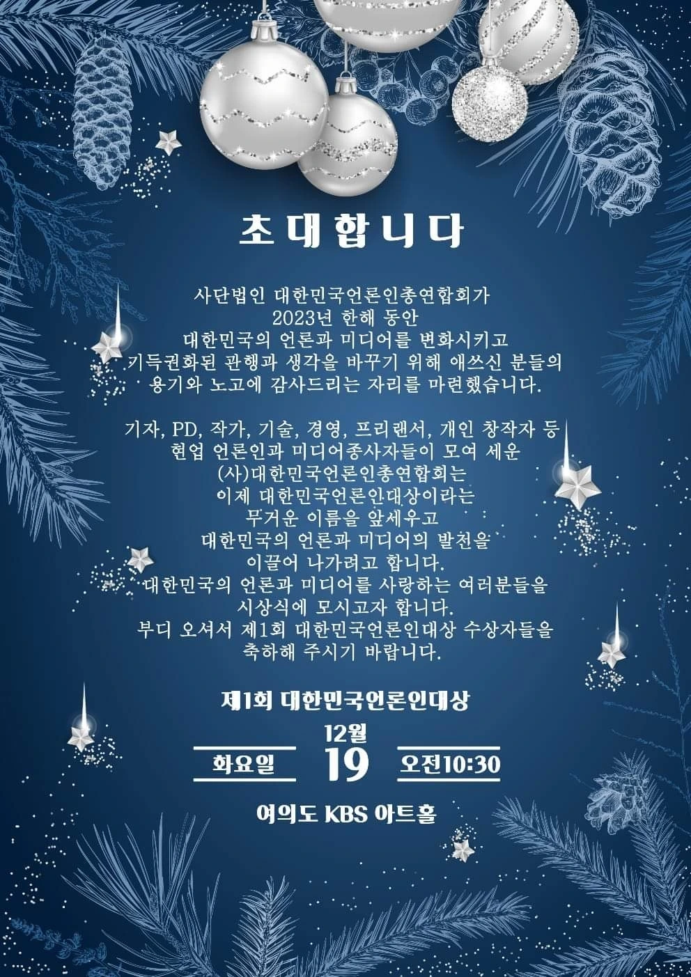 사단법인 대한민국언론인총연합회(이하 언총)이 주최한 이날 행사는 2023년 한 해 동안 대한민국의 언론과 미디어를 변화시키고, 기득화된 관행과 생각을 바꾸기 위해 애쓰신 분들의 용기와 노고 등을 기념하기 위한 자리다.