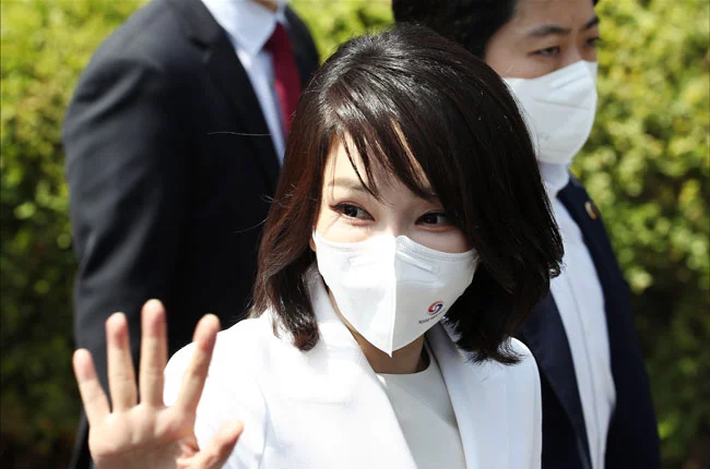 윤석열 대통령의 부인 김건희 여사가 5월 10일 오전 서울 여의도 국회에서 열린 제20대 대통령 취임식에 참석하며 참석자들을 향해 손을 들어 인사를 하고 있다. 사진=뉴시스
