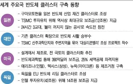 이런 상황에서 일본, 대만, 미국을 포함한 반도체 종주국들이 반도체 클러스터 육성에 사활을 걸었다. 각국이 반도체 산업을 클러스터를 중심으로 지원하는 것은 전후방 가치사슬 연계와 기술·인재집약이 중요한 산업 특성상 클러스터 조성이 유리하기 때문이다. 일본은 대만의 TSMC 투자유치를 위한 최대 규모 보조금(12조원)을 지급하며 구마모토현을 ‘일본 반도체 산업 재건 클러스터’로 조성하고 있다. 대만은 기존의 TSMC 신주과학단지와 주변 지역을 묶어 ‘대(大) 실리콘밸리’를 조성 중이다. 미국은 반도체지원법(CSA)을 통해 390억달러의 보조금을 지급해 전 국토의 클러스터화를 추진하고 있다.