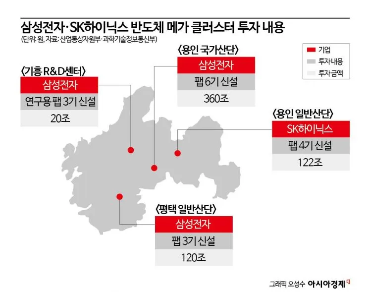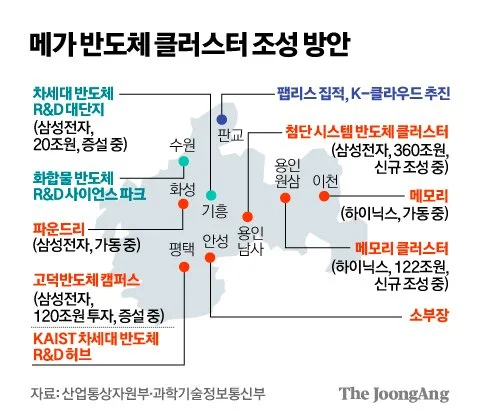 구체적으로 삼성전자와 SK하이닉스가 각각 용인 남사와 용인 원삼에 신규 조성 중인 시스템 반도체 클러스터와 메모리 반도체 클러스터에 각각 360조원과 122조원을 투자한다. 삼성전자는 고덕 반도체 캠퍼스 증설에 120조원을, 기흥 차세대 반도체 R&D 단지 증설에 20조원을 추가 투자한다.