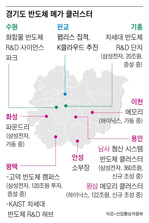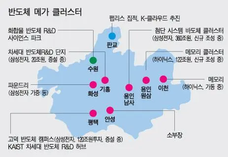 반도체 메가 클러스터는 평택, 화성, 용인, 이천, 안성, 성남 판교, 수원 등 경기 남부에 밀집된 반도체 기업과 기관을 한 데 아우르는 개념으로, 이미 지난해 발표됐다.