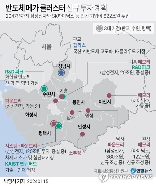 정부는 이날 메가 클러스터 3대 거점으로 판교·수원·평택을 확정했다. 오는 2047년까지 삼성전자와 SK하이닉스 등 민간기업들이 클러스터에 총 622조원을 투자할 방침이다.
