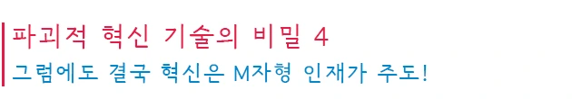 하지만 서로 다른 분야의 사람들을 모아 놓기만 한다고 해서 혁신이 일어나는 것은 아니며 각각의 분야에서 엄청난 전문성을 가지고 있는 사람들이 다양한 사람들과의 접촉을 통해 새로운 관점을 갖게 될 때 파괴적 혁신의 아이디어가 나온다고 하는데요. 그 발견은 개발자에게서 올 수도 있고 기획자에게서 올 수도 있지만 결국은 여러 I자형 인재로부터가 아니라 다양한 관점을 종합해 내고 새롭게 연결해내는 M자형 인재에게서 결국 나타나는 것으로 드러났습니다.