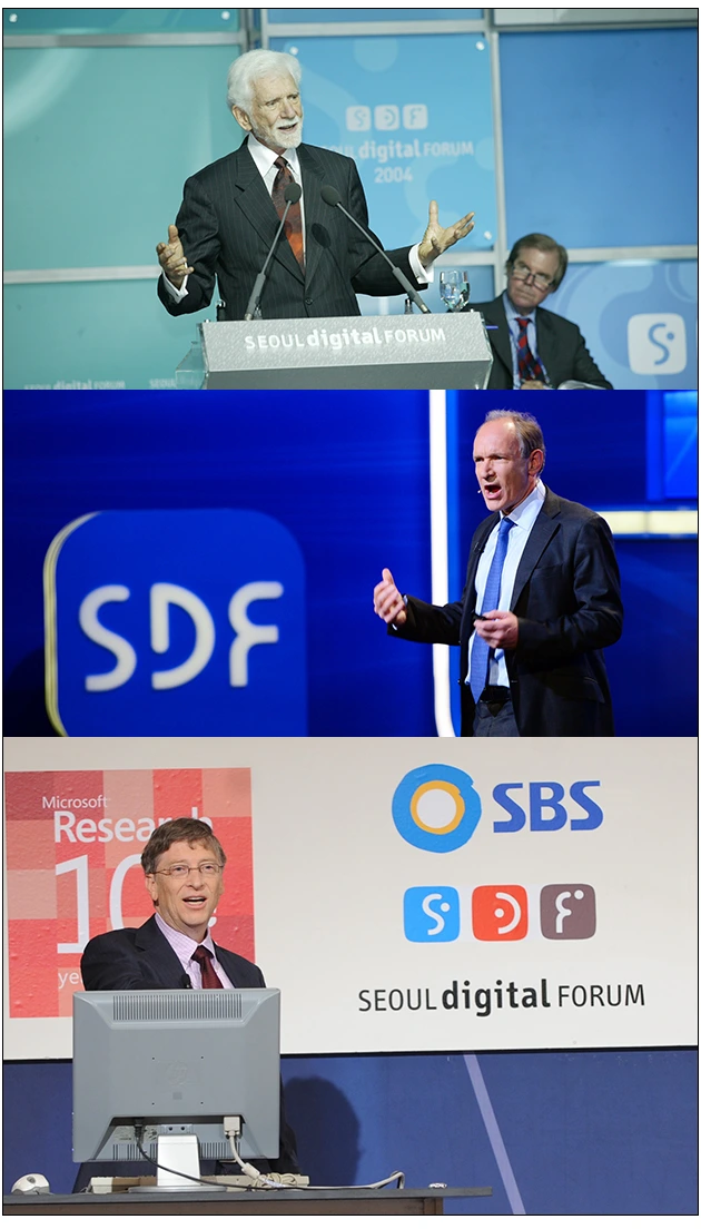 ▲ SDF2004 대표연사 ‘휴대전화의 아버지’ 마틴 쿠퍼, SDF2013의 기조연사 WWW의 창시자 팀 버너스-리, SDF2008의 기조연사 MS회장 빌 게이츠