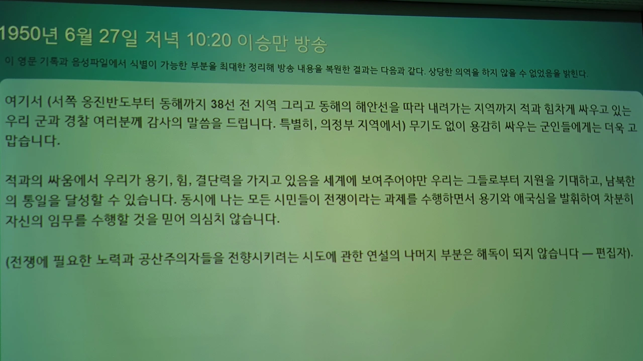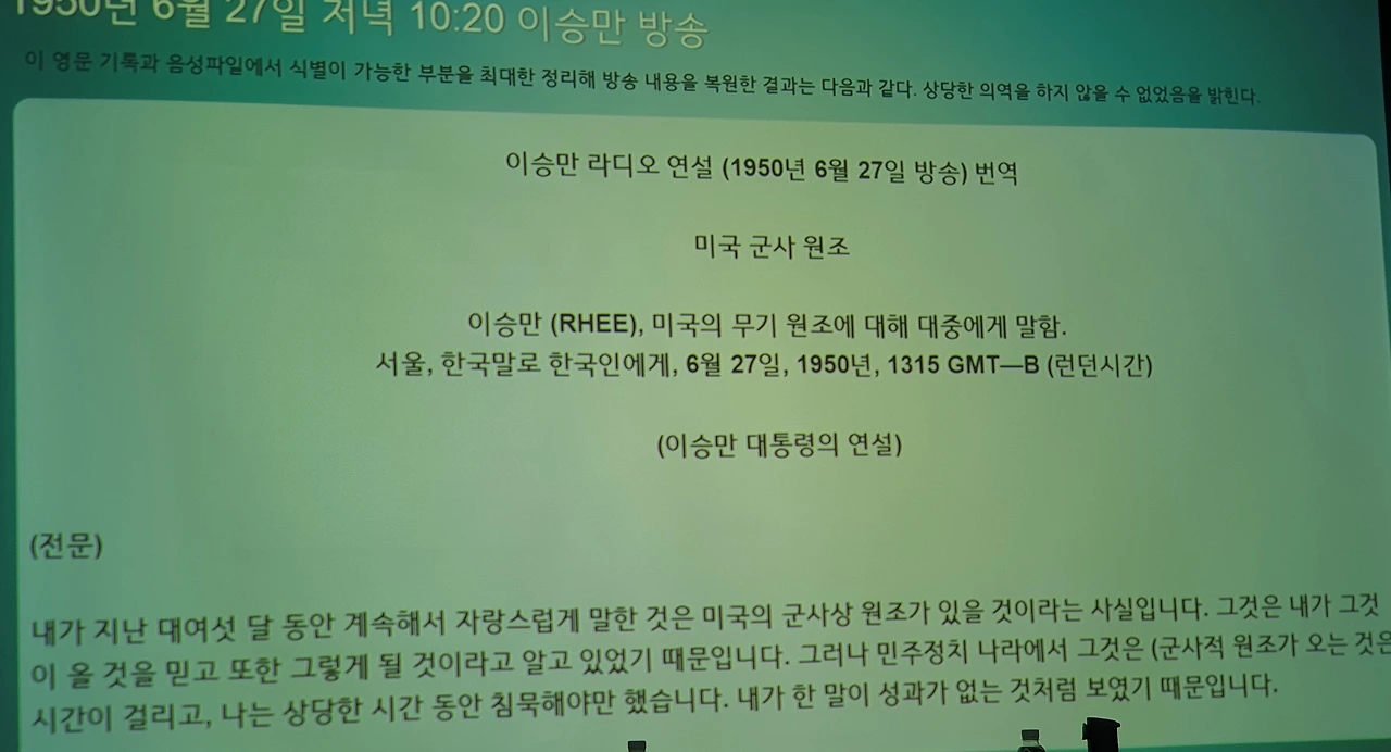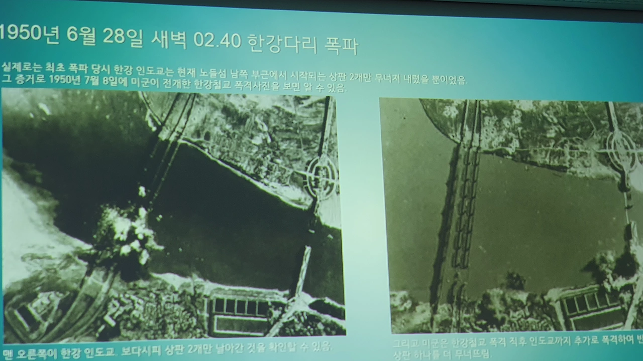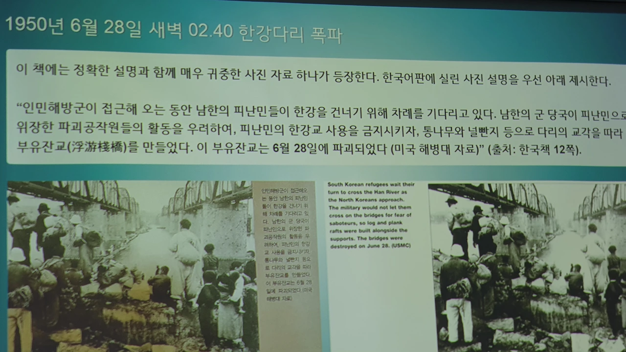 이 대통령의 당시 행적에 관한 구체적 사료를 제시한 류 교수는 “김상웅 교수 등 학계에서 ‘이승만의 한강 다리 폭파설과 민간인 대량 사망설’을 주장했고 이게 기정사실처럼 받아들여지면서 이 대통령이 ‘서울시민은 안심하라’고 말하고 도망갔다는 거짓 이미지가 만들어졌다”며 종북세력의 모략행위를 경계했다.