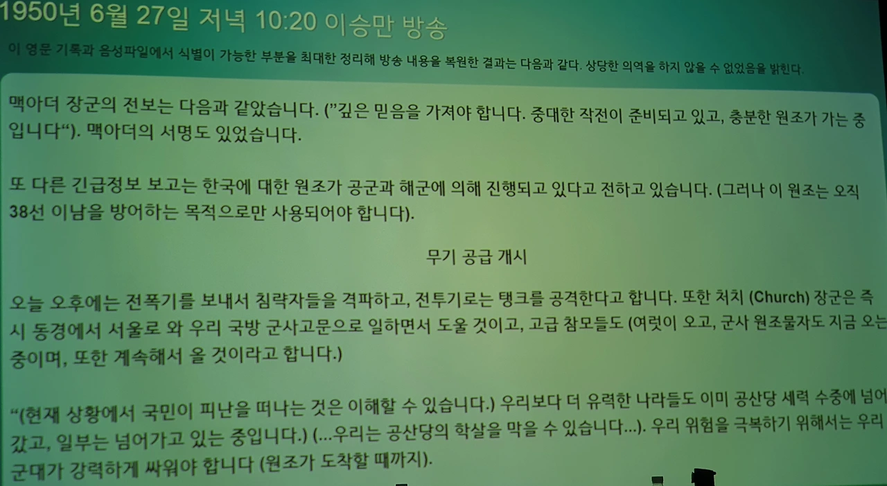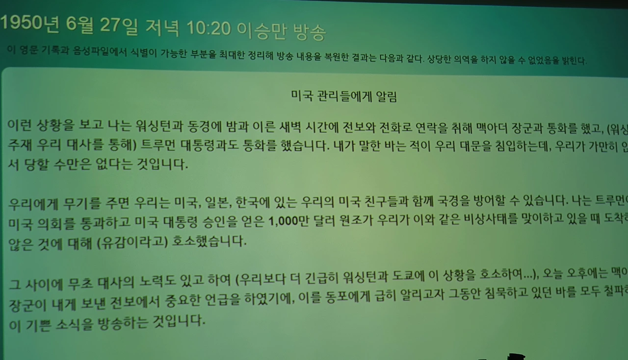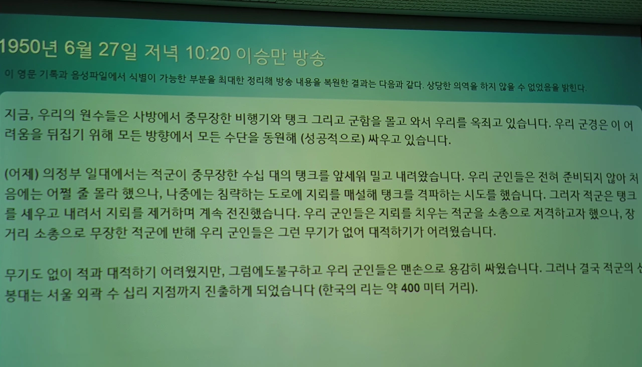 이 대통령의 당시 행적에 관한 구체적 사료를 제시한 류 교수는 “김상웅 교수 등 학계에서 ‘이승만의 한강 다리 폭파설과 민간인 대량 사망설’을 주장했고 이게 기정사실처럼 받아들여지면서 이 대통령이 ‘서울시민은 안심하라’고 말하고 도망갔다는 거짓 이미지가 만들어졌다”며 종북세력의 모략행위를 경계했다.