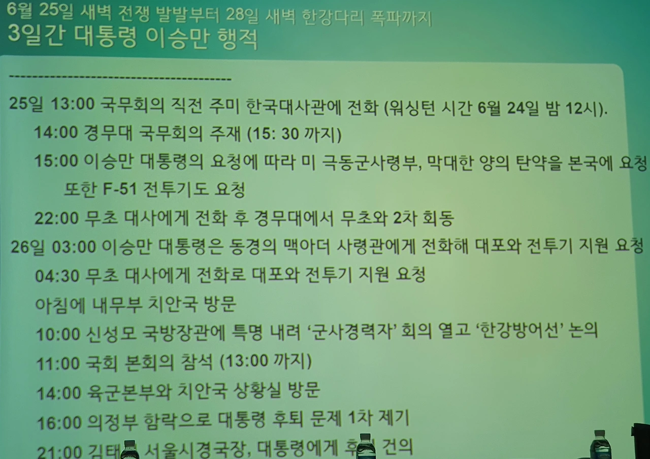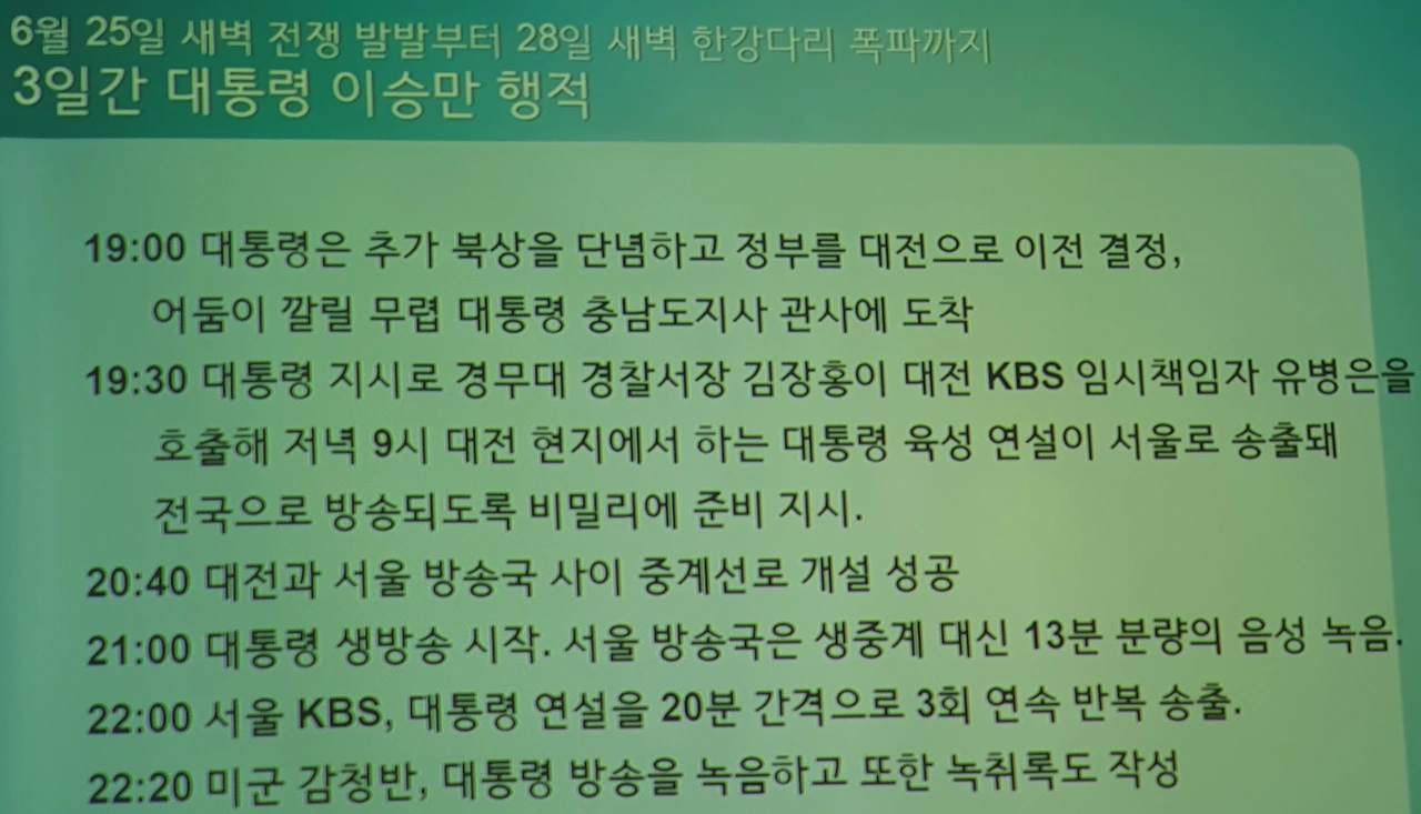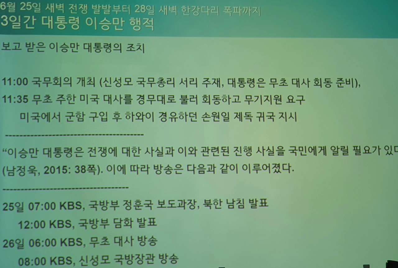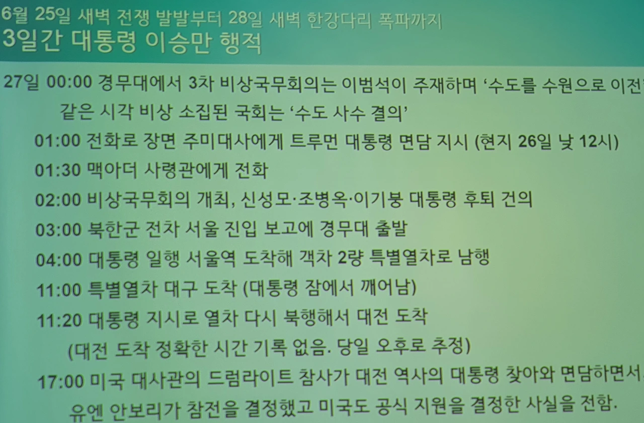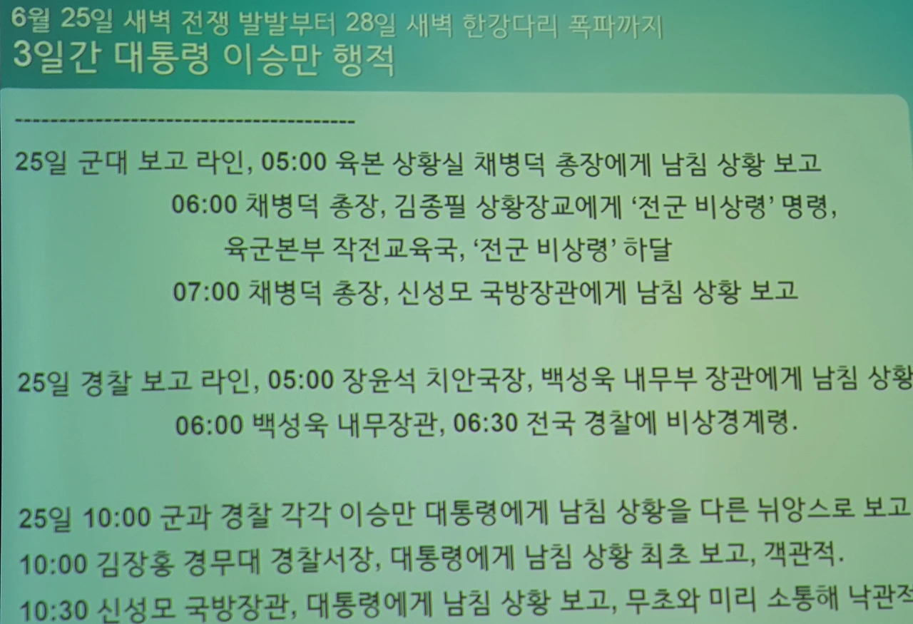 그는 6·25 당시 대통령 연설문 등을 토대로 전쟁 발발 당시를 재구성한 뒤 “도리어 주변 참모들이 대통령에게 ‘피신하라’고 권유해도 이 대통령은 거절했다”며 “순식간에 남침 당한 상황에서 국가의 대통령이 전선에서 총에 맞아 죽거나 포로가 되는 것보다 후방에서 후일을 도모하며 지휘해야 한다는 참모들의 합리적 권유에 따랐을 뿐”이라고 거듭 강조했다.