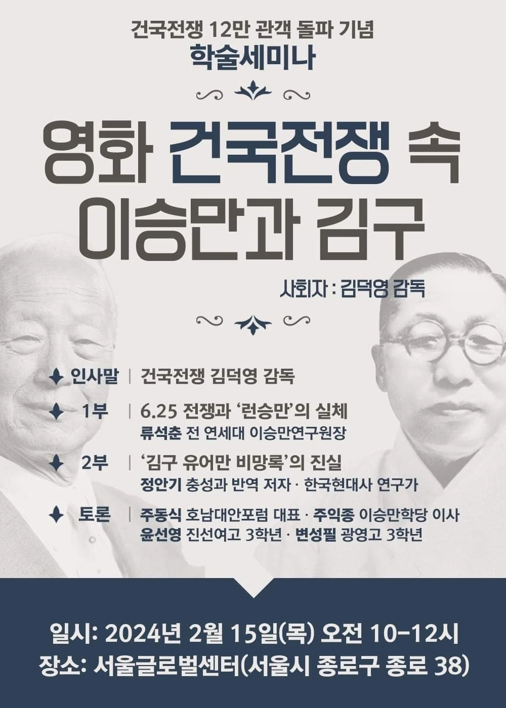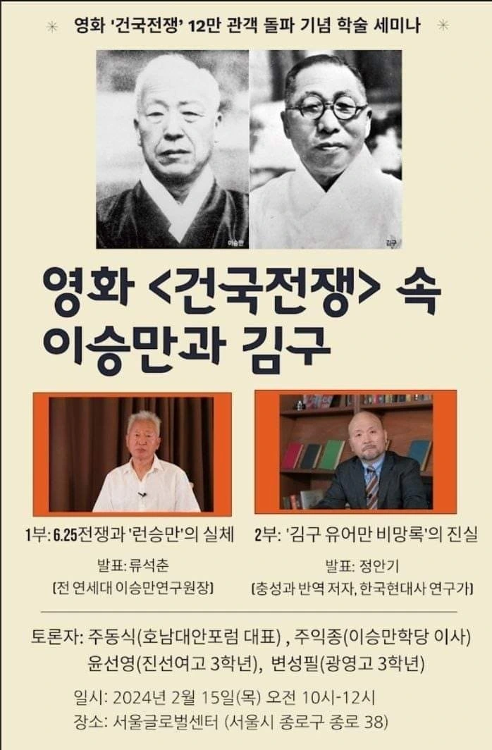 류석춘 전 연세대 교수는 15일 서울 종로구 서울글로벌센터에서 ‘영화 건국전쟁 속 이승만과 김구’를 주제로 열린 학술토론회에서 “6월25일 남침이 일어났을 때 이승만 대통령은 국군통수권자로서 국회에 협조를 구하고 군에게 무기 공급 등 협조를 구한 데다 주한 미국 대사에게 미국 정부의 협조를 요청한 사실이 명확한 기록으로 남아 있다”며 이같이 밝혔다.