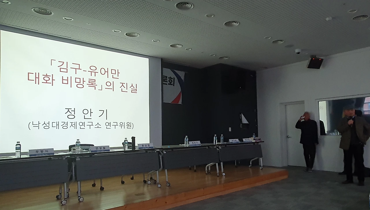 정안기 낙성대경제연구소 연구위원은 김구에 대한 재평가가 필요하다는 주장을 폈다. 정 위원은 6·25전쟁 당시 주한 중국 공사였던 유어만의 ‘비망록’을 인용해 김구가 북한과 적화통일에 호의적이었던 사실을 함께 바라봐야 한다고 강조했다.