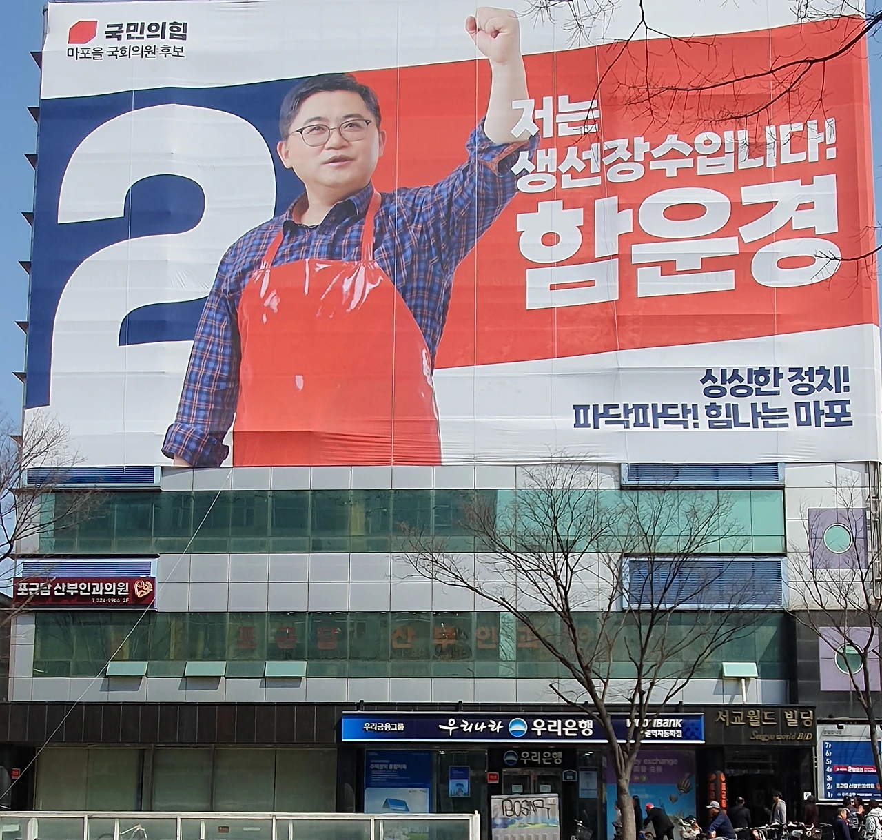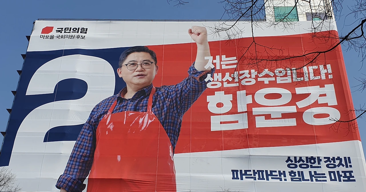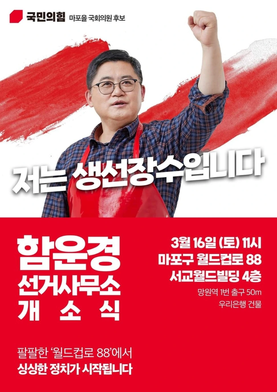 "저는 생선장수 함운경입니다. 싱싱한 정치! 파닥파닥! 힘나는 마포! 팔팔한 '월드컵로 88'에서 싱싱한 정치가 시작됩니다"