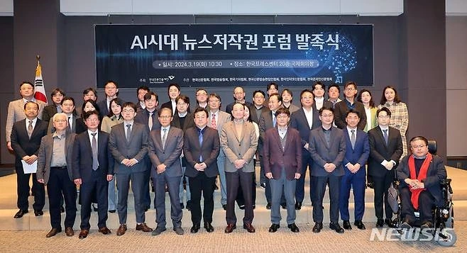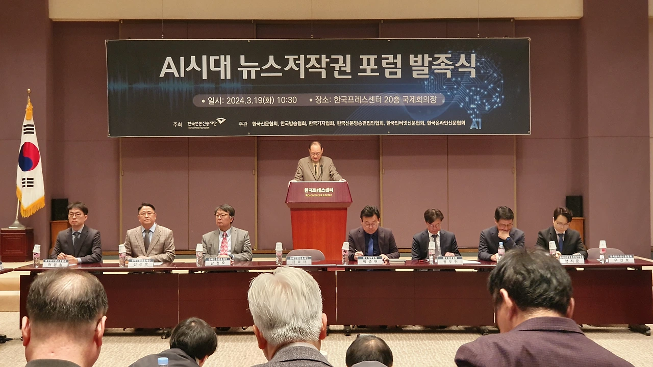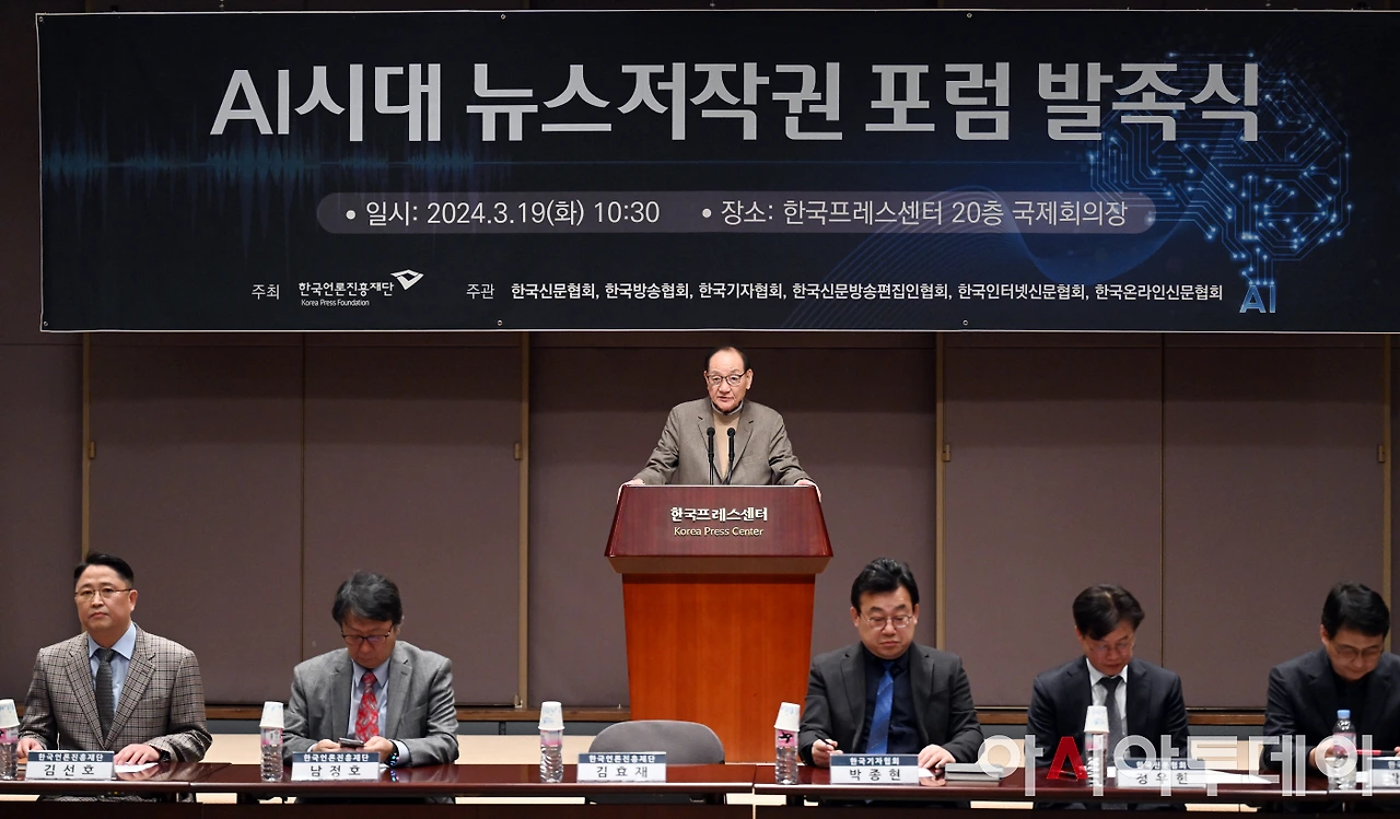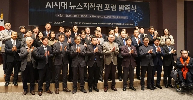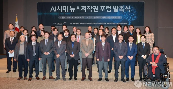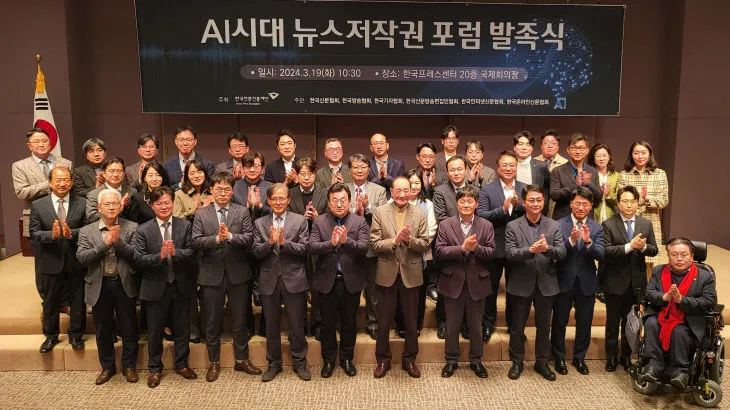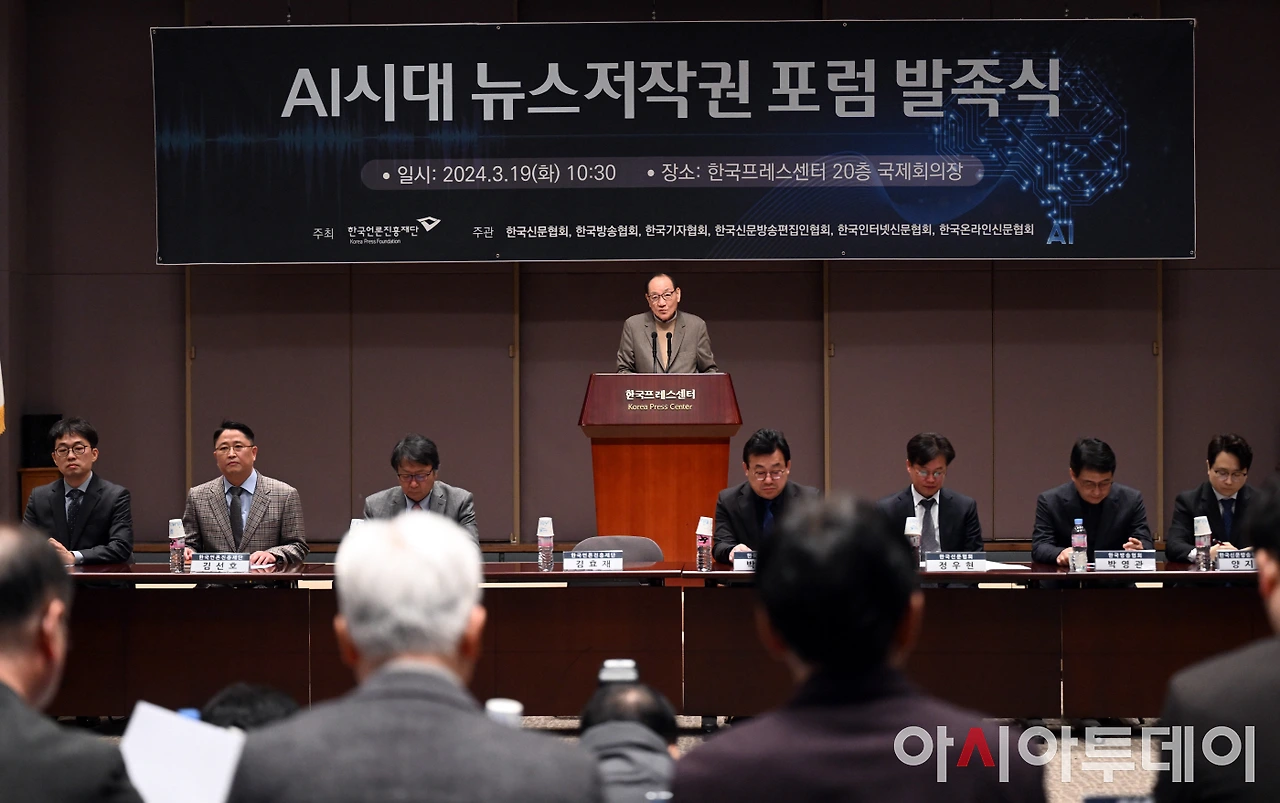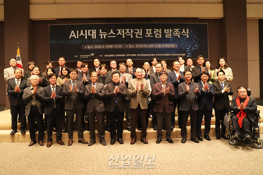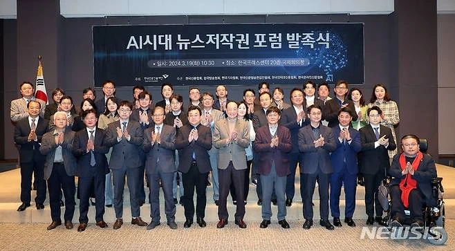 한국언론진흥재단은 19일 오전 한국프레스센터 20층 국제회의장에서 ‘AI시대 뉴스저작권 포럼’ 발족식을 개최했다. 이 포럼은 뉴스저작권 보호와 생성형AI 기술 등 디지털환경 변화에 대한 대응 방안을 마련함으로써 건강한 언론 환경을 조성하기 위한 취지로 발족됐다. 한국언론진흥재단 주최, 한국신문협회·한국방송협회·한국기자협회·한국신문방송편집인협회·한국인터넷신문협회·한국온라인신문협회의 공동주관으로 향후 6개월간 진행된다.