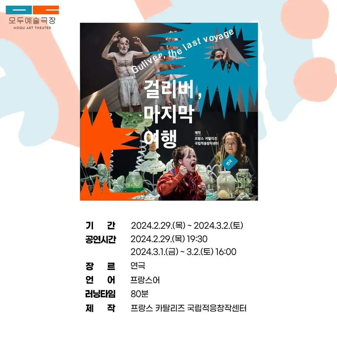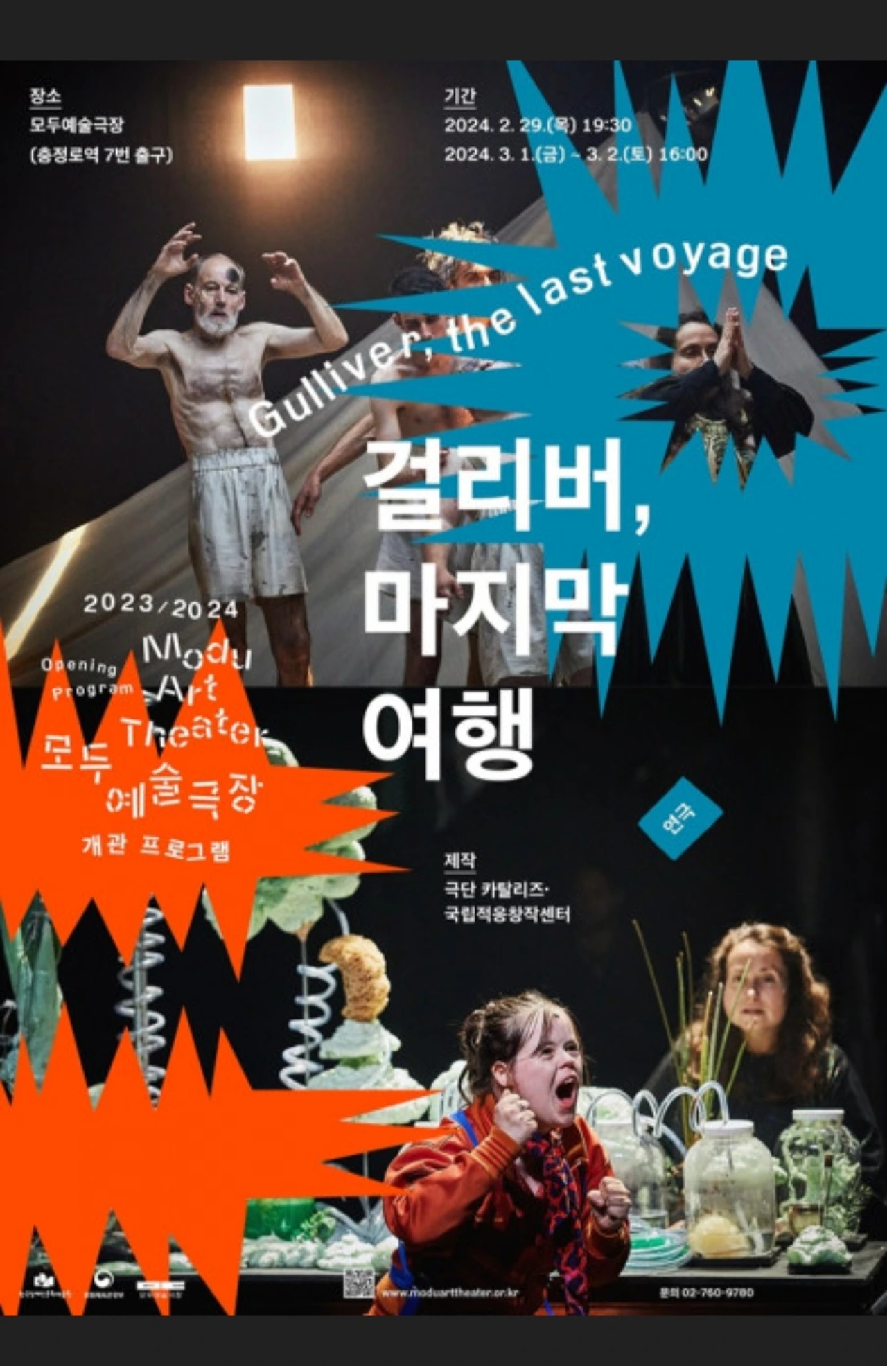 공연소개 : 조너선 스위프트의 소설 『걸리버 여행기』를 기반으로 현대 사회·정치·윤리 등에 대한 부조리함을 유쾌하면서도 깊이 있게 그려낸 연극으로 발달장애인 배우들이 직접 극작에 참여하고 연기한 작품이다. 걸리버가 난파된 이후 라푸타 군도에서 만난 4개의 특별한 섬, 그리고 그 섬에 살고 있는 주민들을 소개하며 우리의 서투른 유토피아에 관한 질문을 던진다.