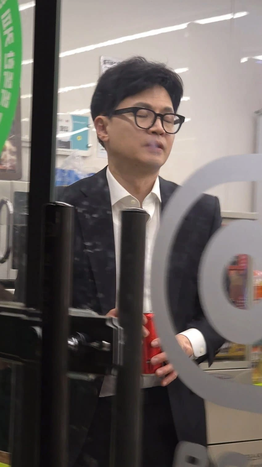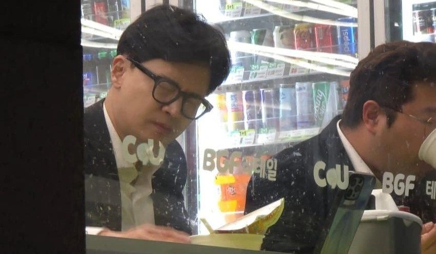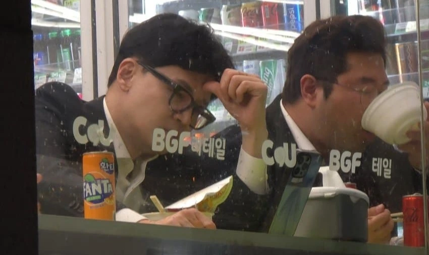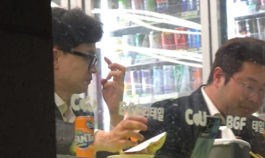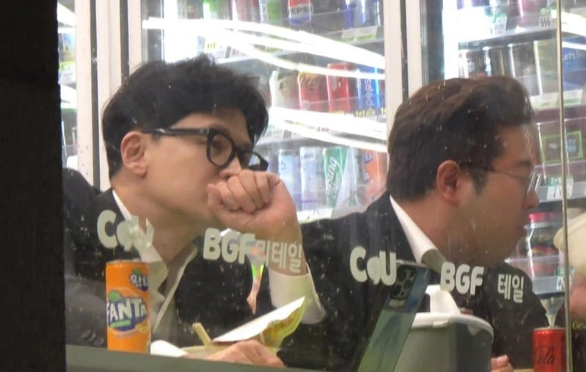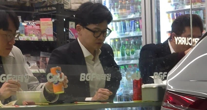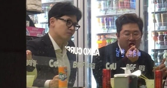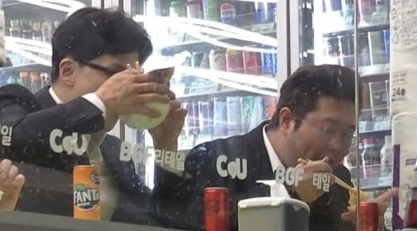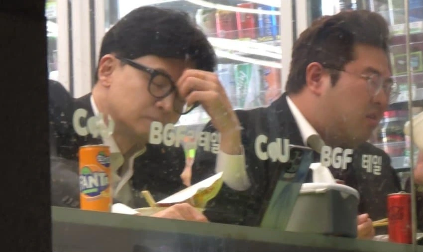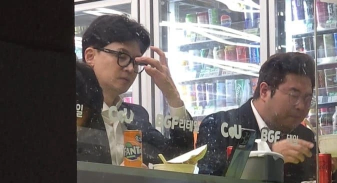 한동훈 국민의힘 비상대책위원장 겸 총괄선대위원장이 31일 저녁 경기 남부와 서울 강남권 순회 유세이후 서울의 한 편의점에서 끼니를 떼우는 장면이 시민에 의해 포착돼 인터넷에 확산되고 있다.