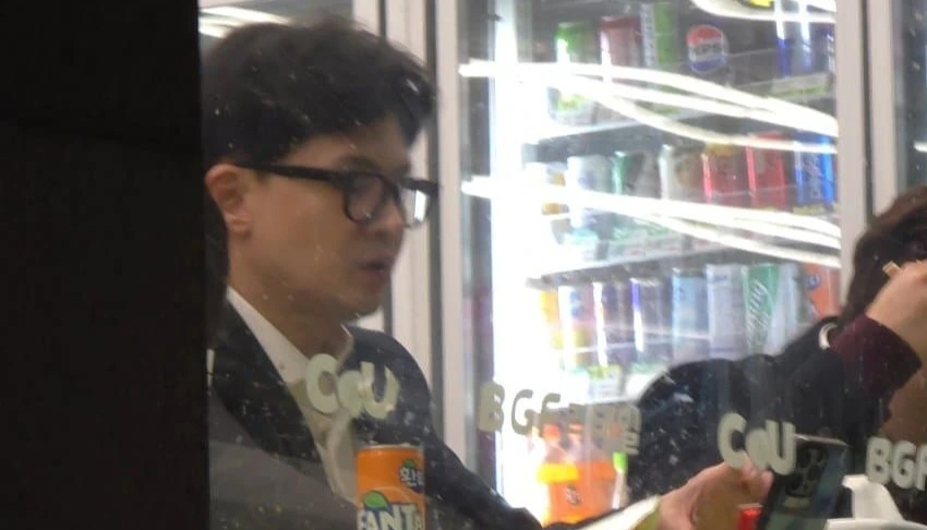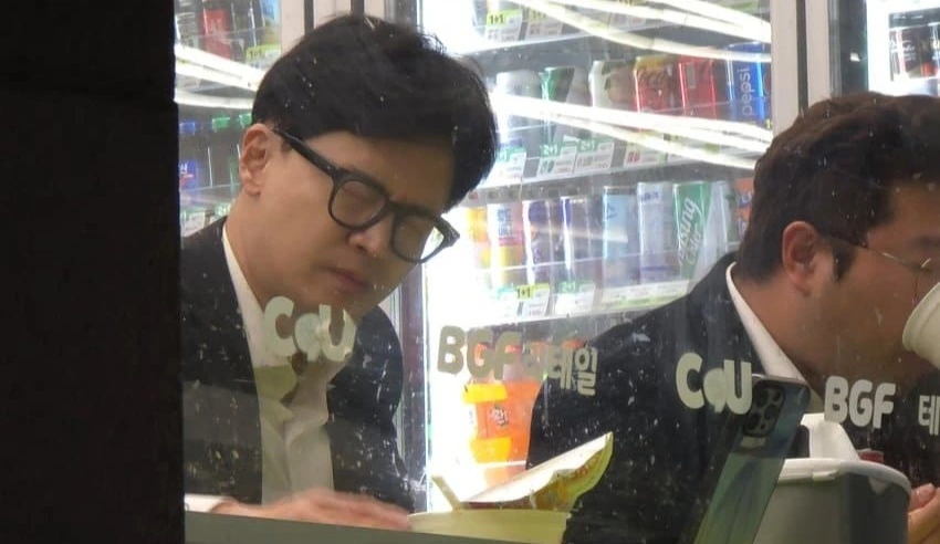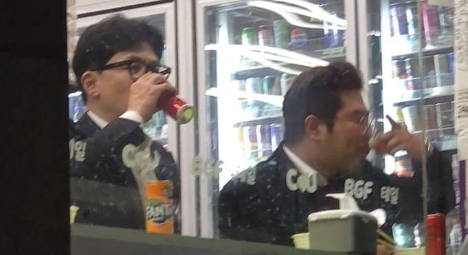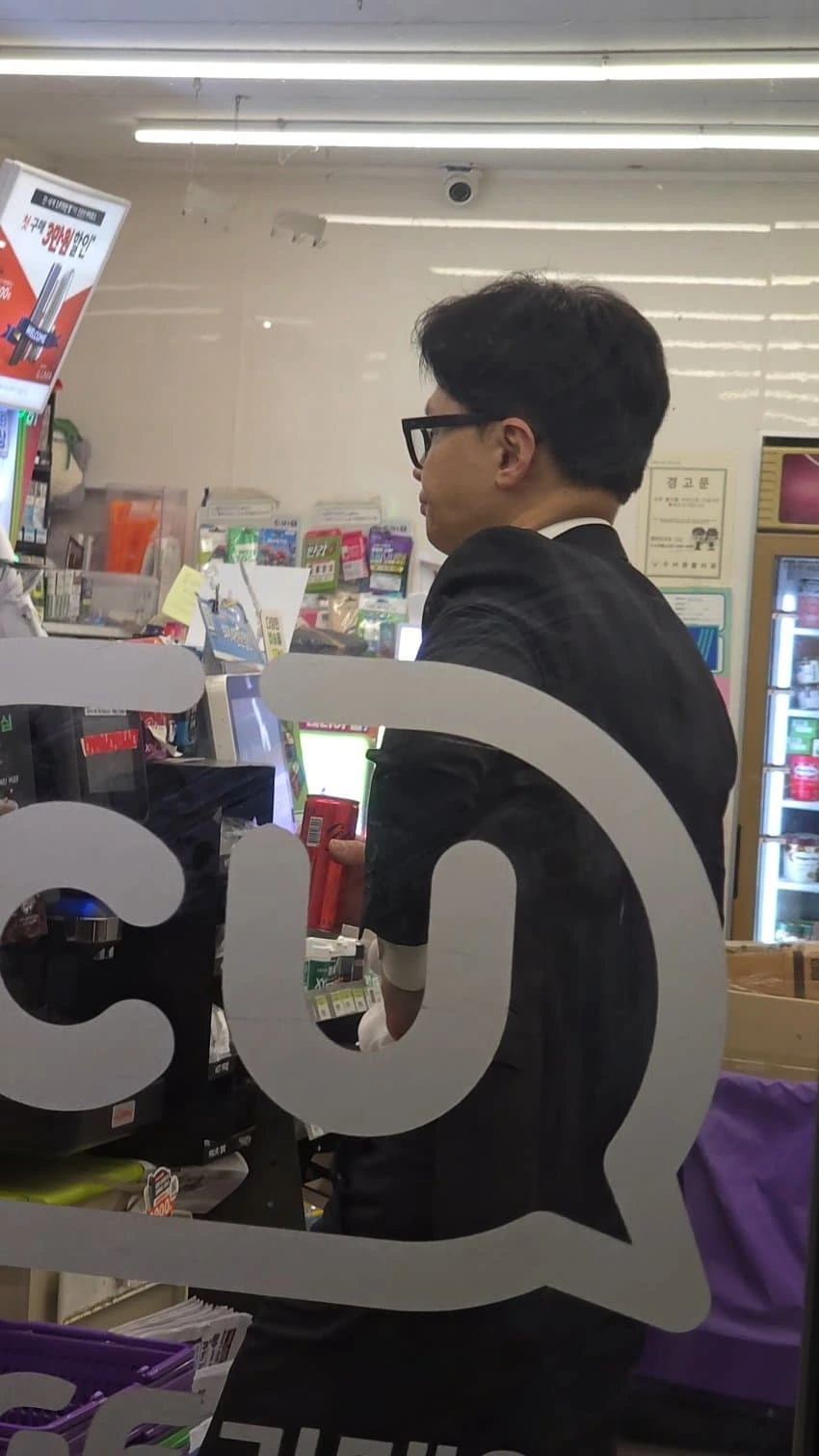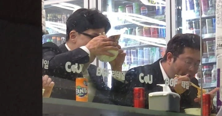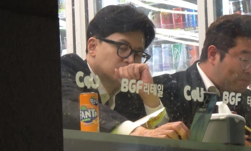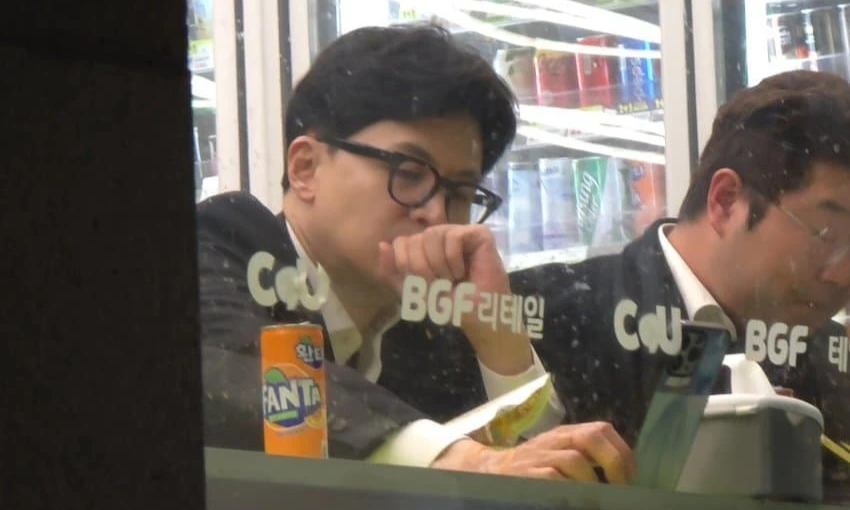 한동훈 국민의힘 비상대책위원장 겸 총괄선대위원장이 31일 저녁 경기 남부와 서울 강남권 순회 유세이후 서울의 한 편의점에서 끼니를 떼우는 장면이 시민에 의해 포착돼 인터넷에 확산되고 있다.