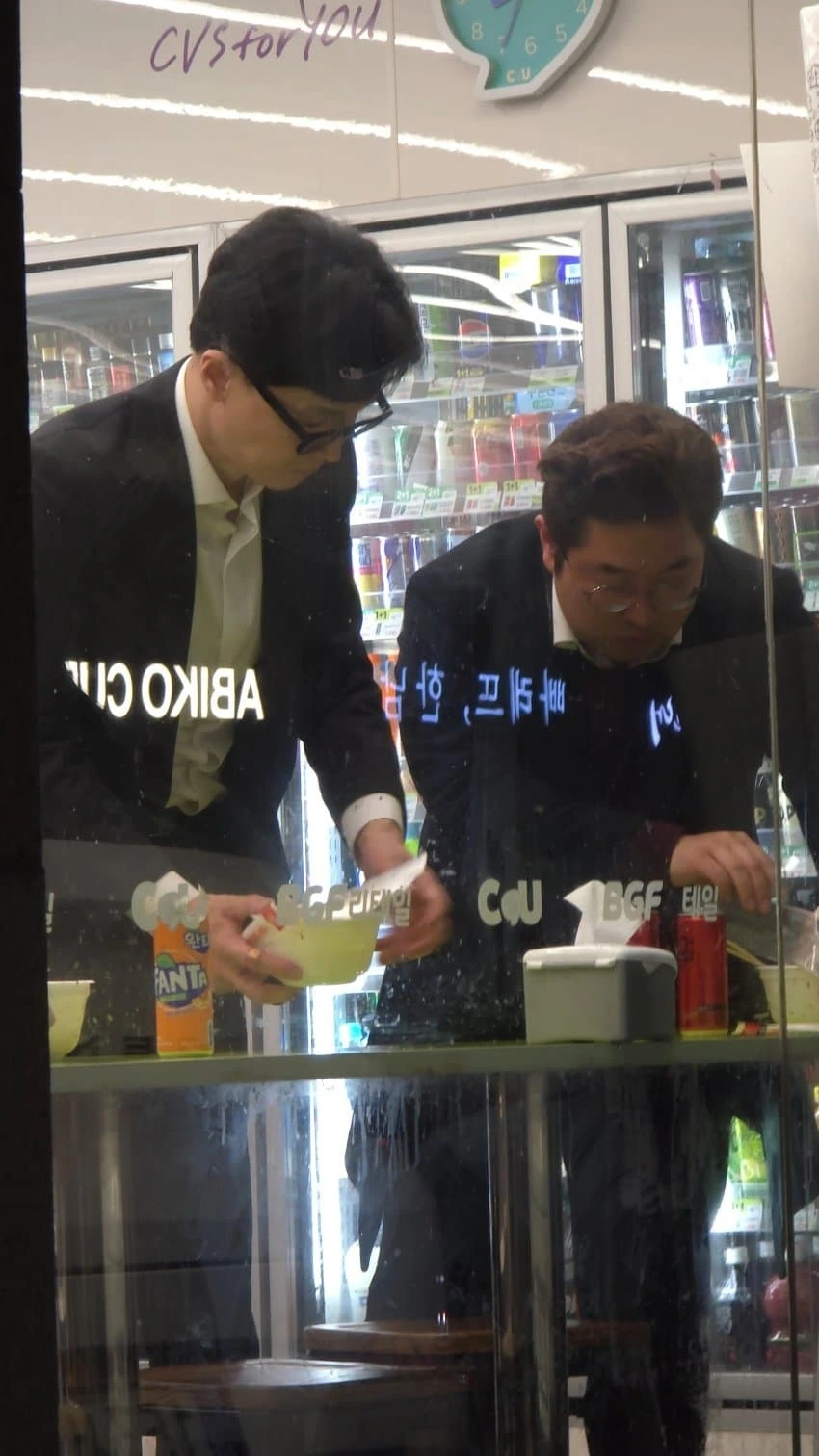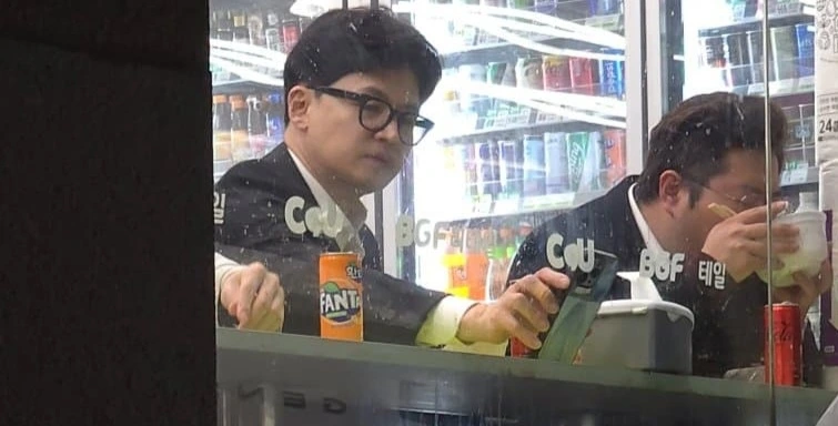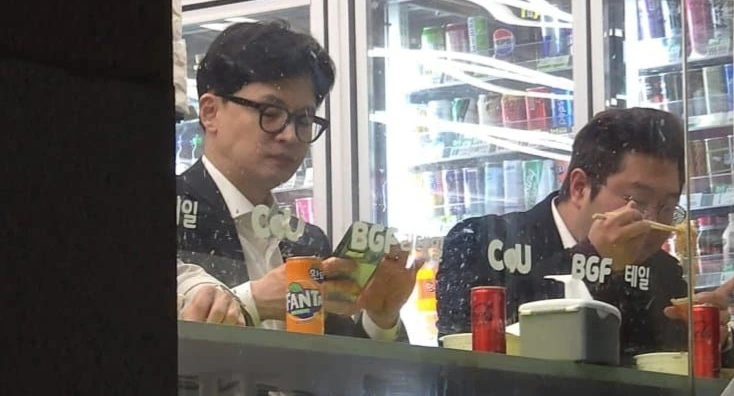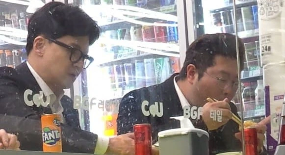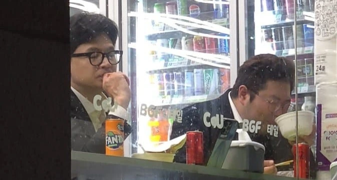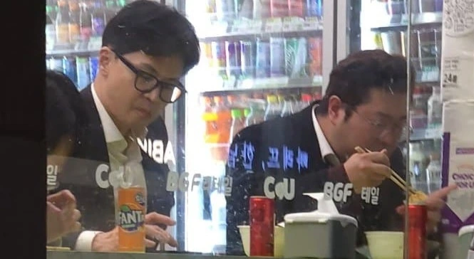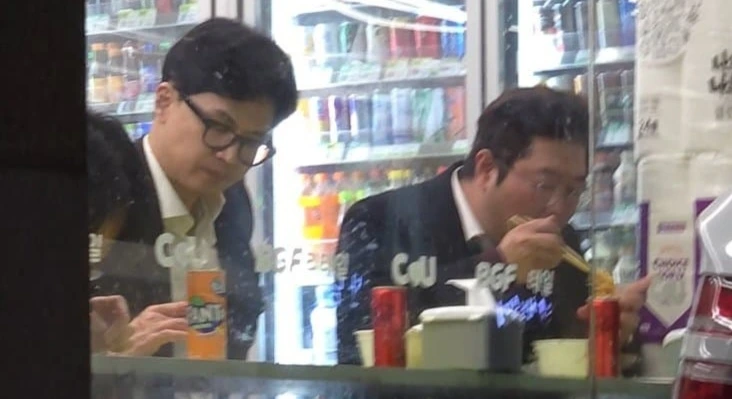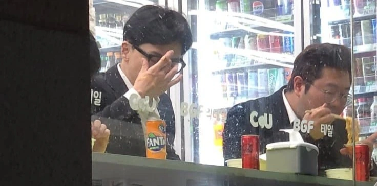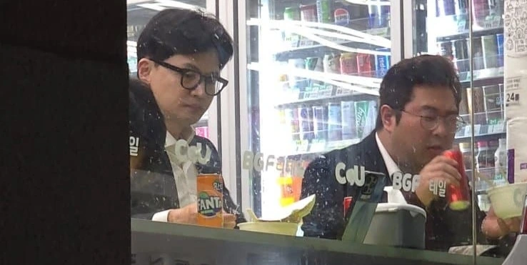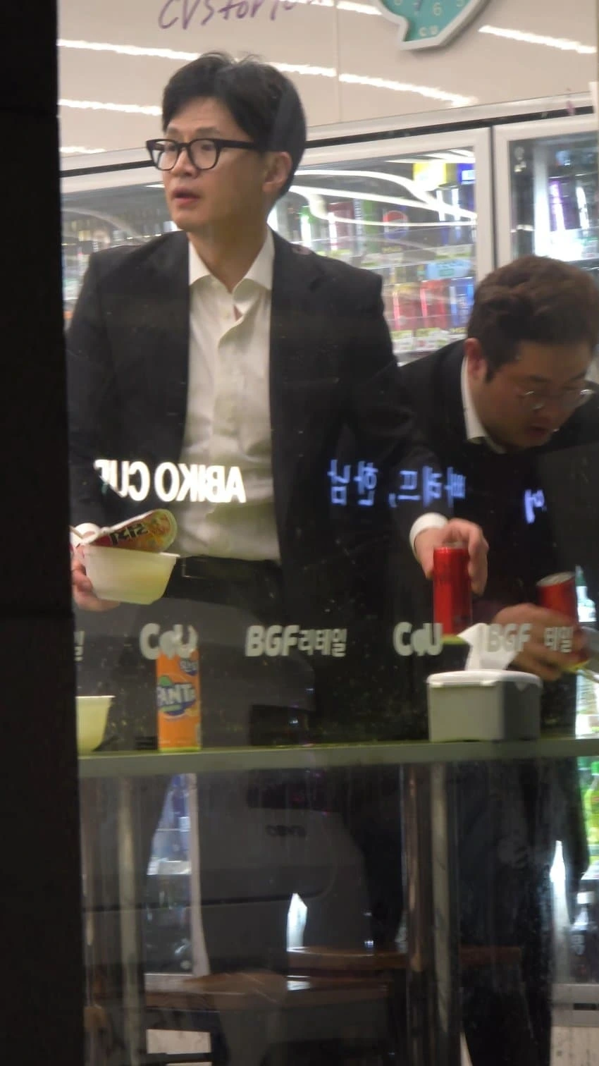 한동훈, 수도권 유세 마치고 편의점서 컵라면 먹는 장면 포착…나흘째 수도권 유세 중 수행원과 함께