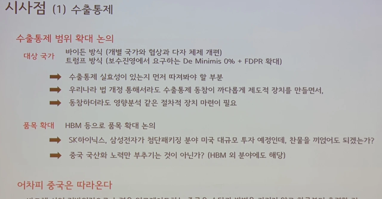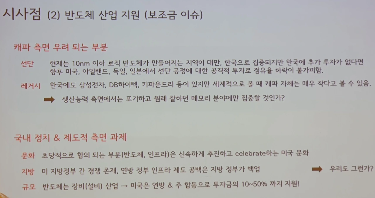 연원호 대외경제정책연구원 경제안보팀장은 첨단 반도체 제조 분야에만 집중된 보조금 논의를 팹리스(설계)와 소부장(소재·부품·장비), 범용(레거시) 분야로 확대해 전략적인 지급을 고민해야 한다고 짚었다. 연 팀장은 "미국과 유럽, 일본은 자국이 부족한 반도체 분야에 보조금을 쓴다"며 "(국내 경쟁력이 높은) 메모리보단 소부장, 디자인, 파운드리 등 취약 분야에 보조금을 줘야 한다"고 말했다. 또 "첨단 반도체만 주목하고 있는데, 범용에도 관심을 갖고 대응해야 한다"고 강조했다.